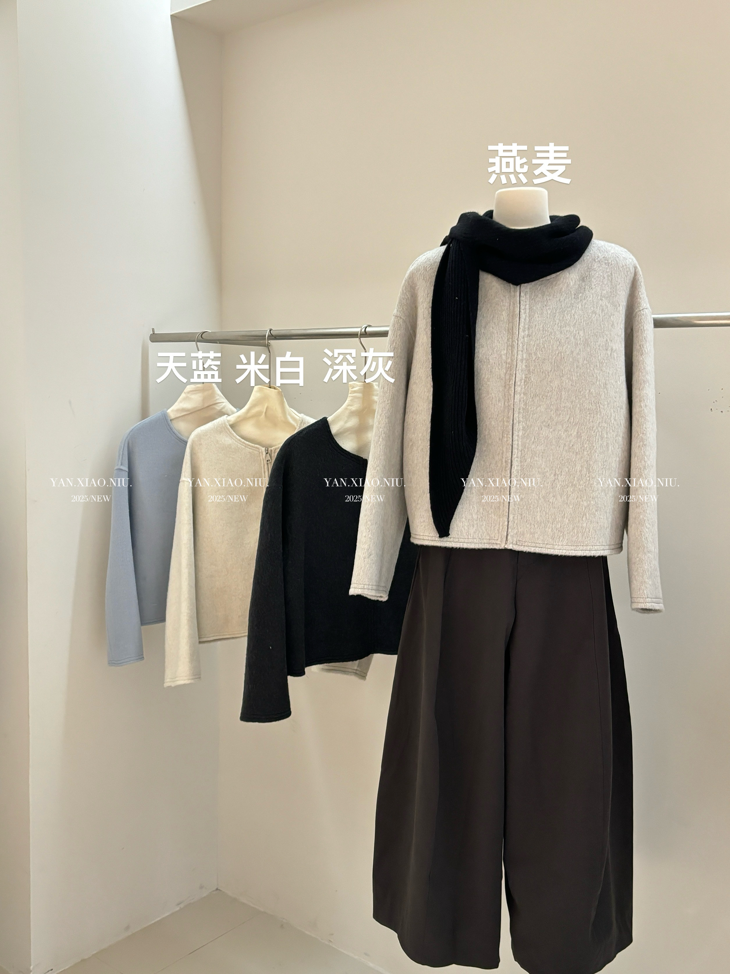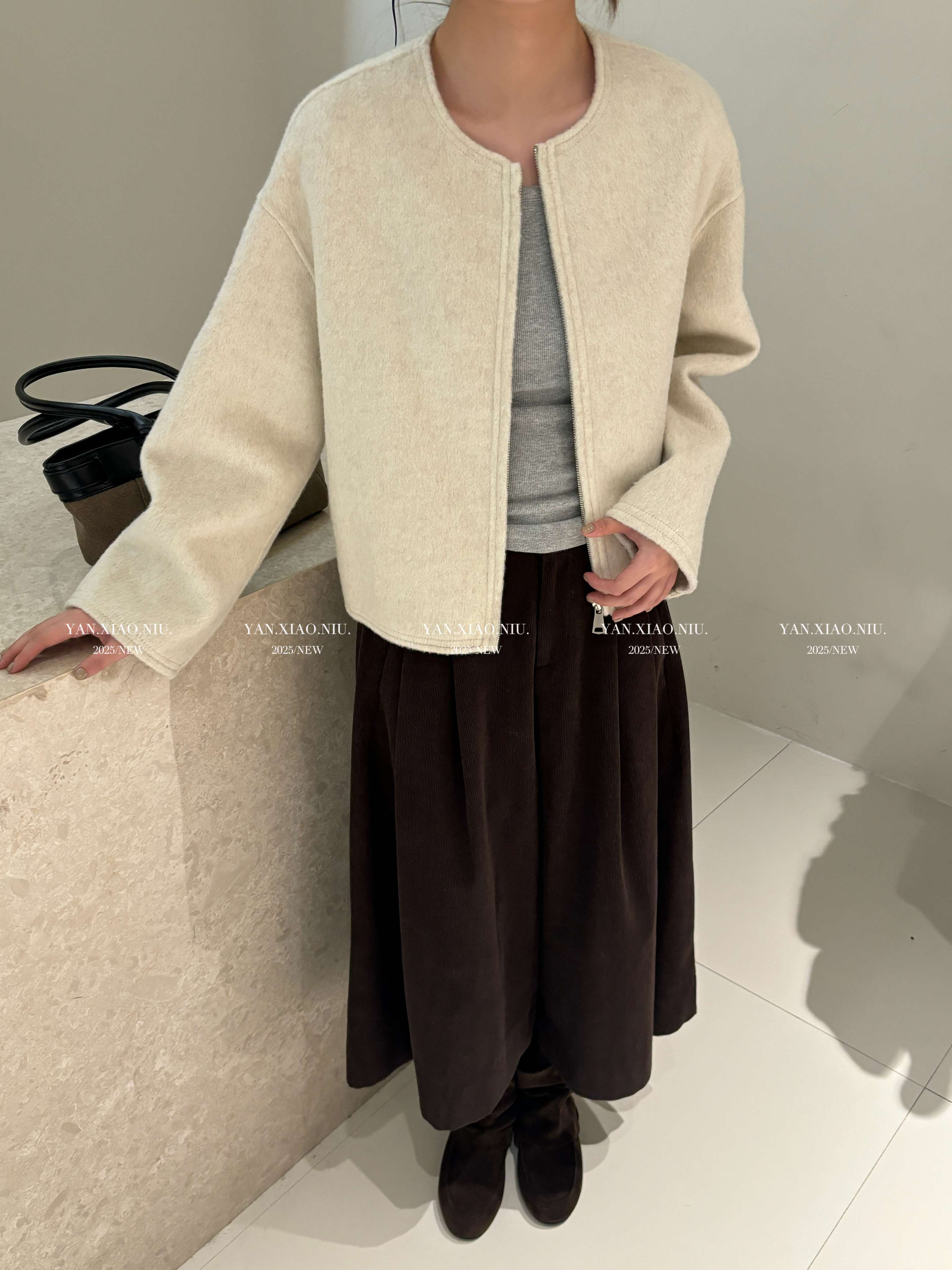 1291韩版百搭设计感圆领拉链双面羊毛大衣短款小个子毛呢外套女