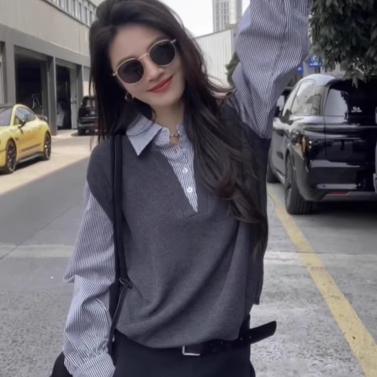 法国Rixo Tina法式假两件条纹衬衫女春季新款设计感小众长袖上衣
