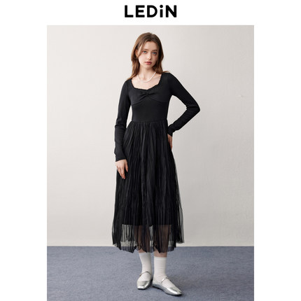 乐町芭蕾风吊带连衣裙秋季新款针织拼接网纱裙仙女感小黑裙