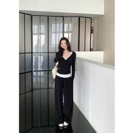 交叉v领短款连帽上衣+休闲裤套装