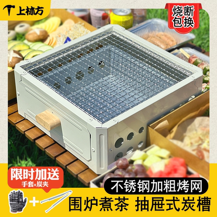 上林方围炉煮茶烤火炉套装烧烤炉子家用户外商用不锈钢网方形烤炉