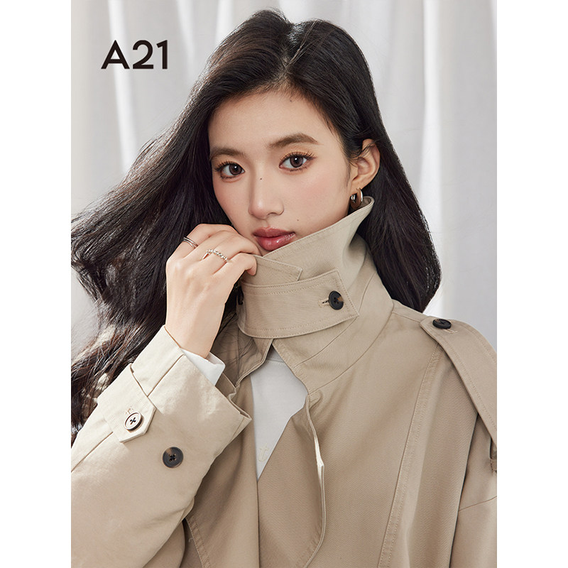 A21女装长袖西装领中长款风衣