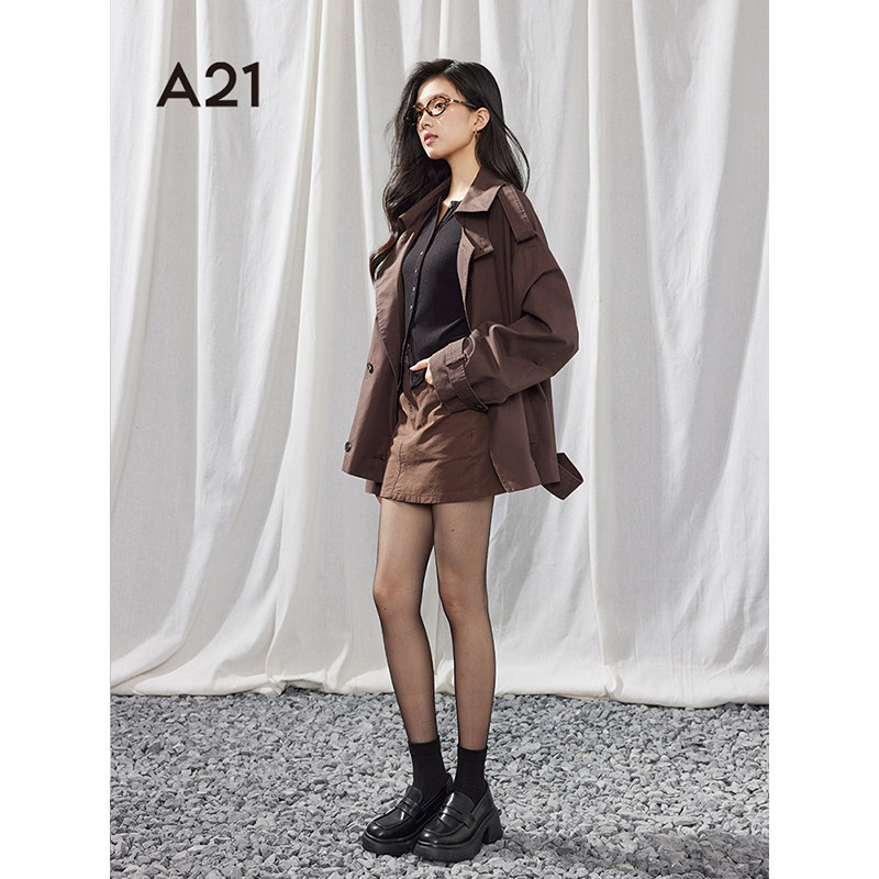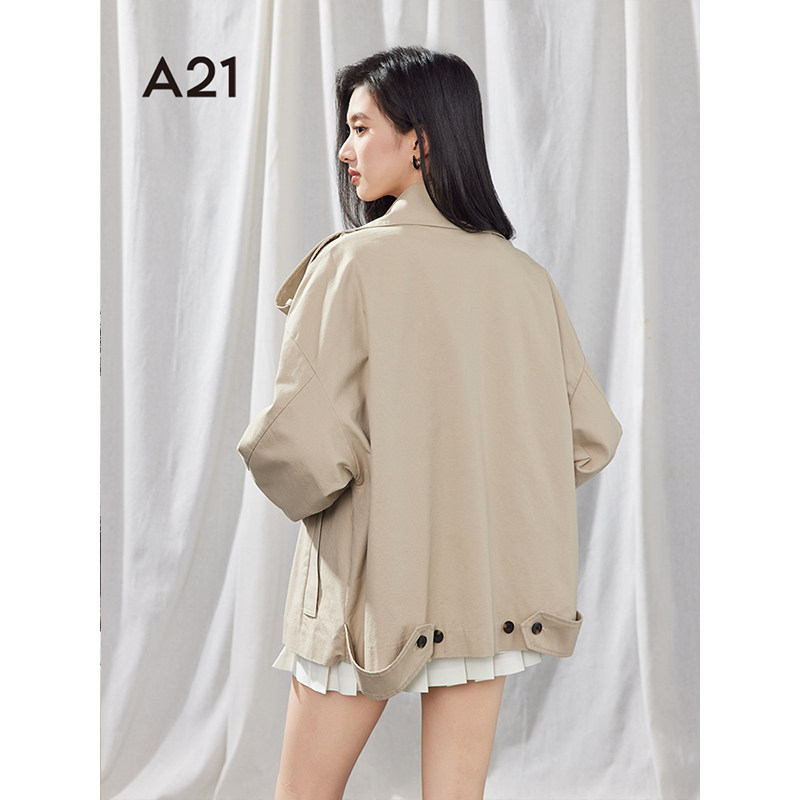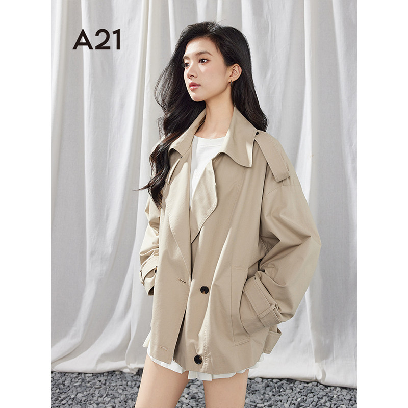 A21女装宽松风衣2025春季新款简约西装领肩章双排扣夹克长袖外套