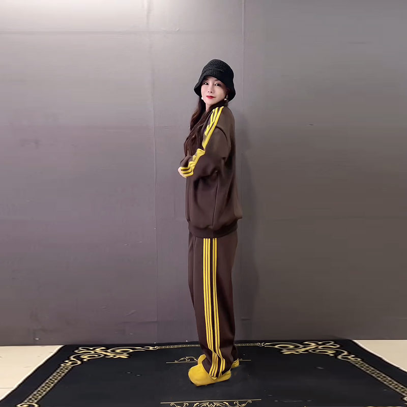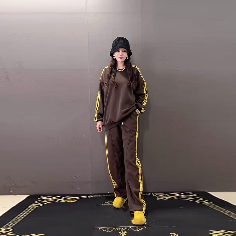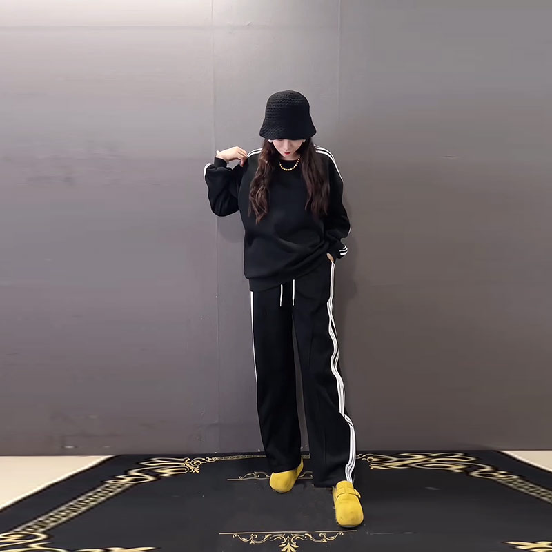 大码女装圆领拼色条长袖上衣松紧腰阔腿长裤胖妹妹韩版休闲两件套