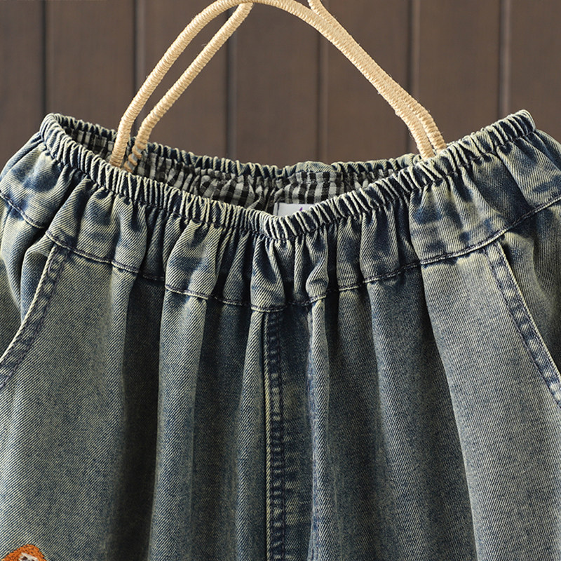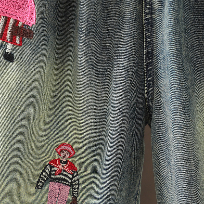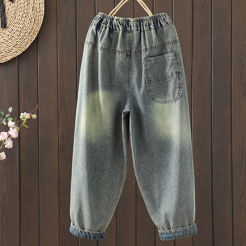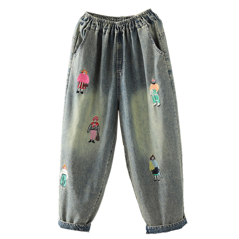 折扣春秋新款刺绣牛仔哈伦9分裤 国风中式裤子休闲裤胖mm宽松版