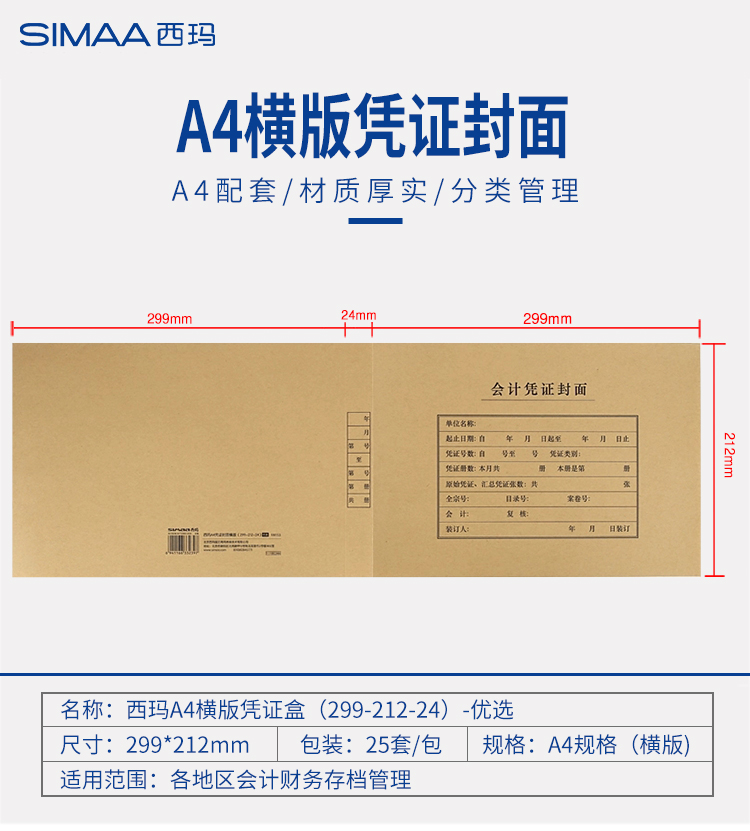 SIMAA西玛A4财务会计凭证封面一体式横版 299*212*24mm A4规格财务会计单据记账凭证纸FM153全A4凭证封皮封套