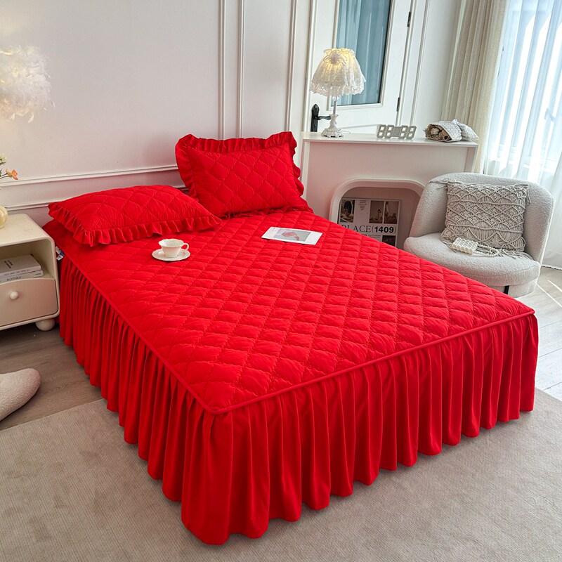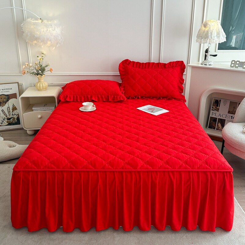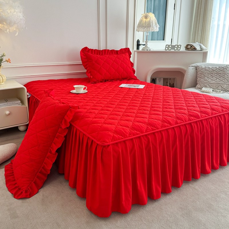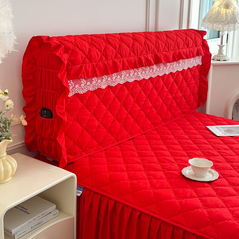 大红床笠式床裙二合一三件套纯色婚庆结婚单件夹棉防滑床罩床头罩