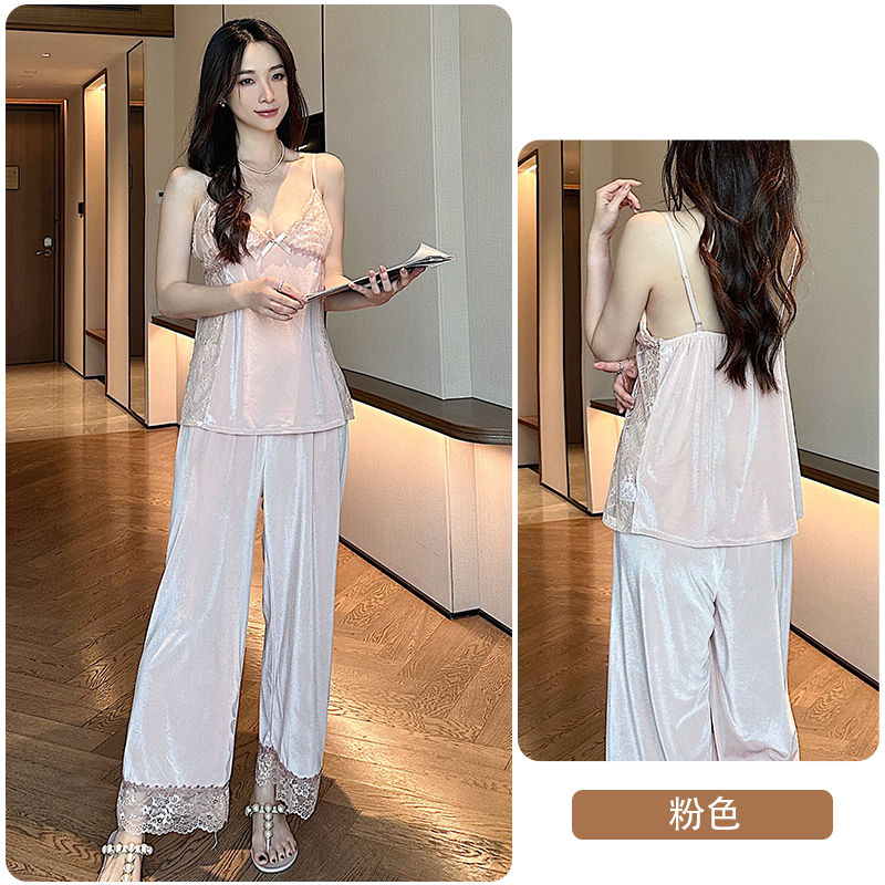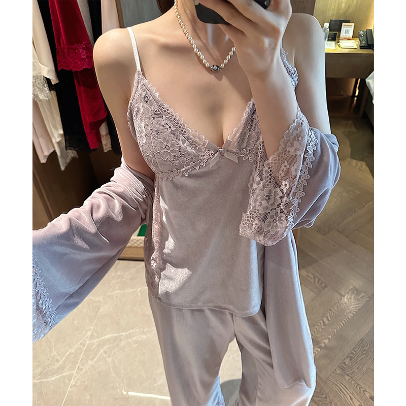 金丝绒睡衣女秋冬季2025新款带胸垫性感吊带睡袍三件套家居服薄绒
