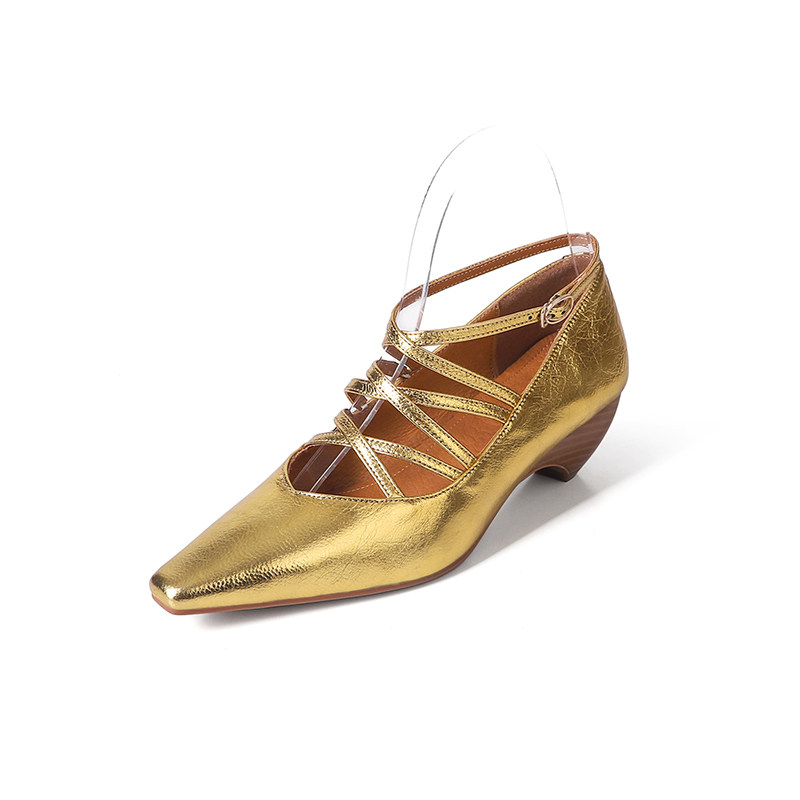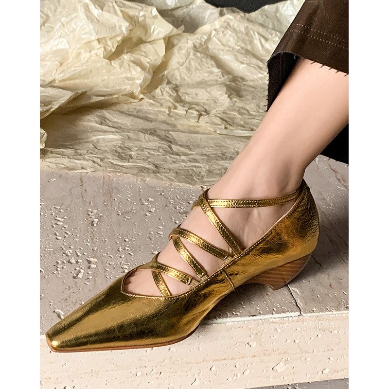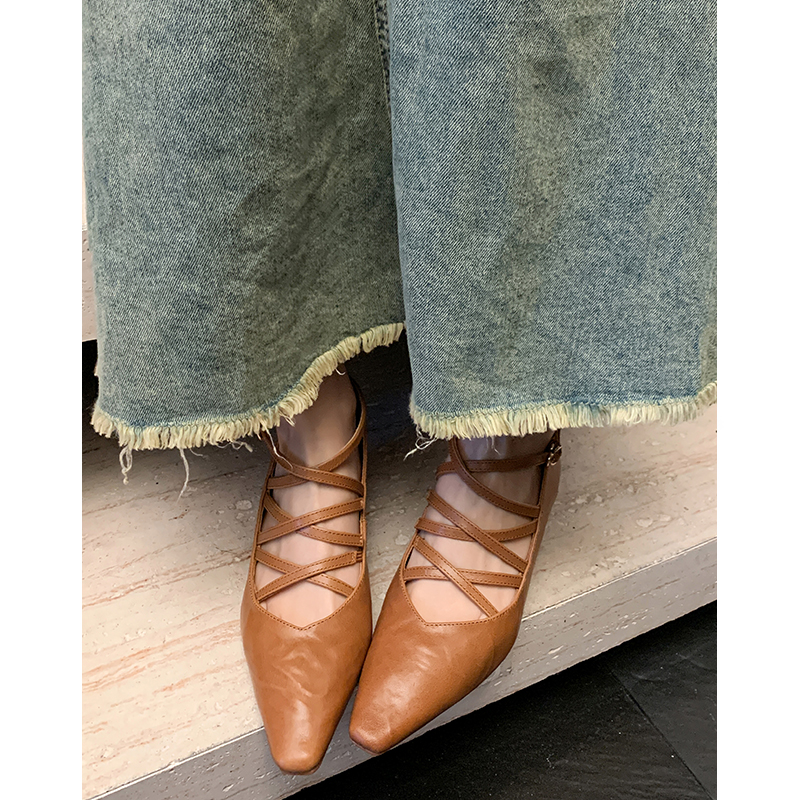 Kmeizu巨软~羊皮单鞋女时尚交叉绑带中跟罗马4.5cm粗跟玛丽珍鞋