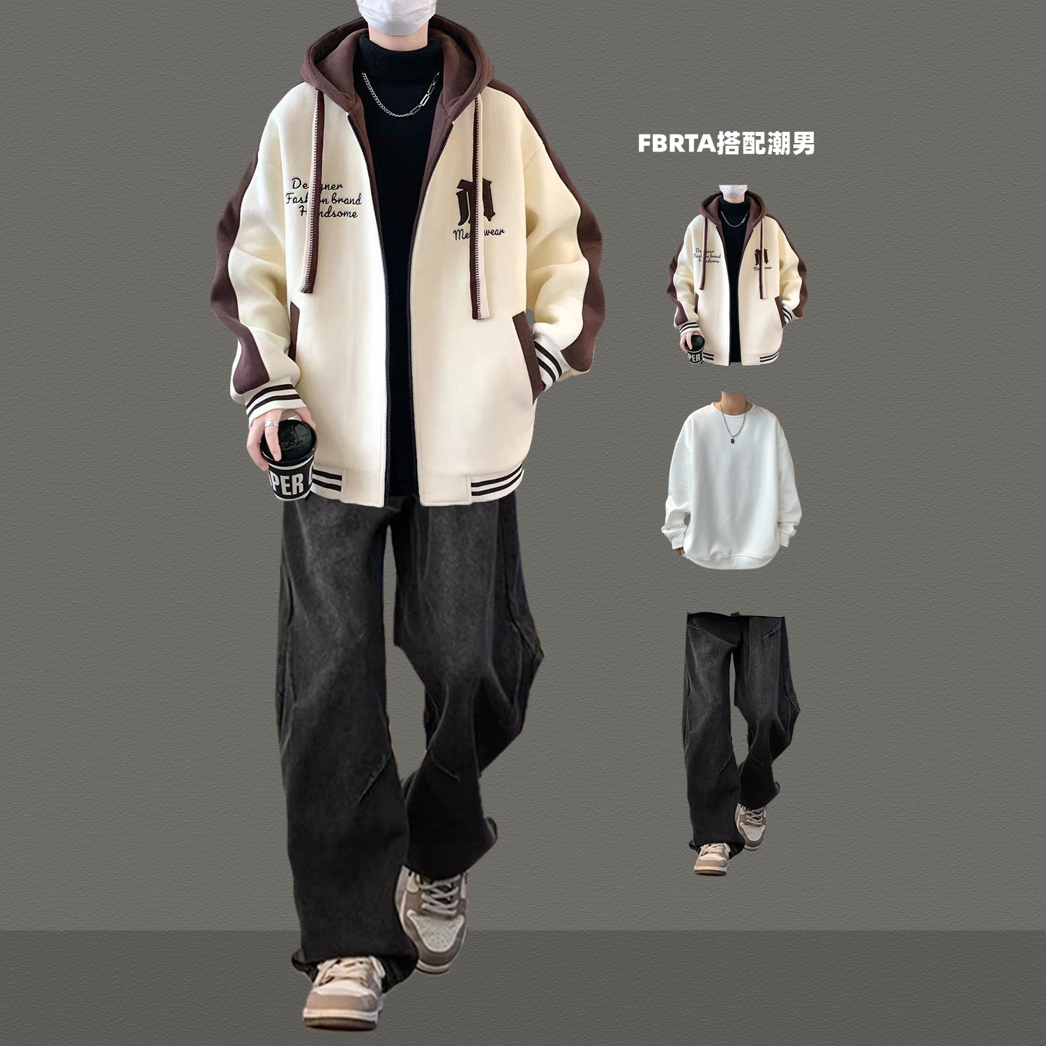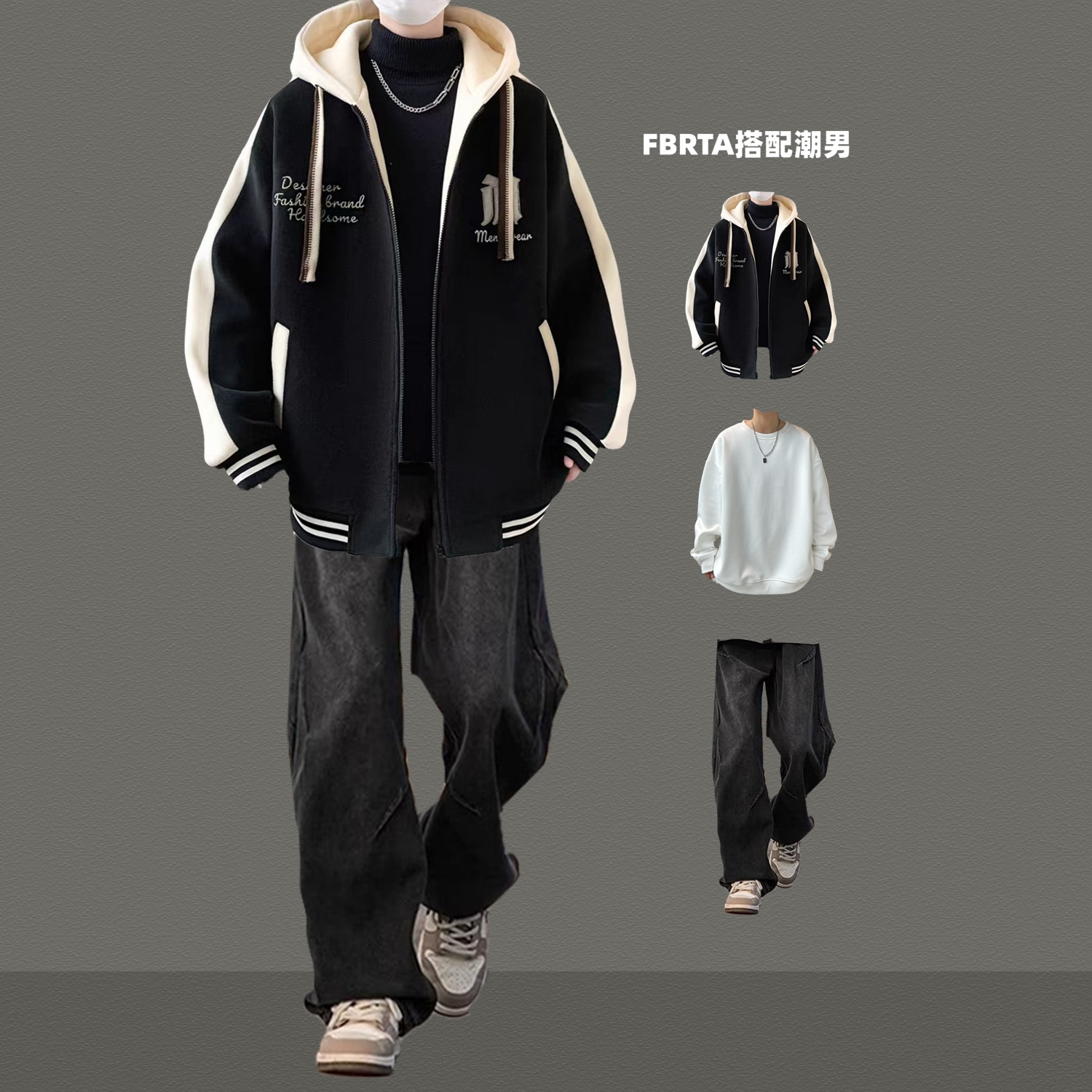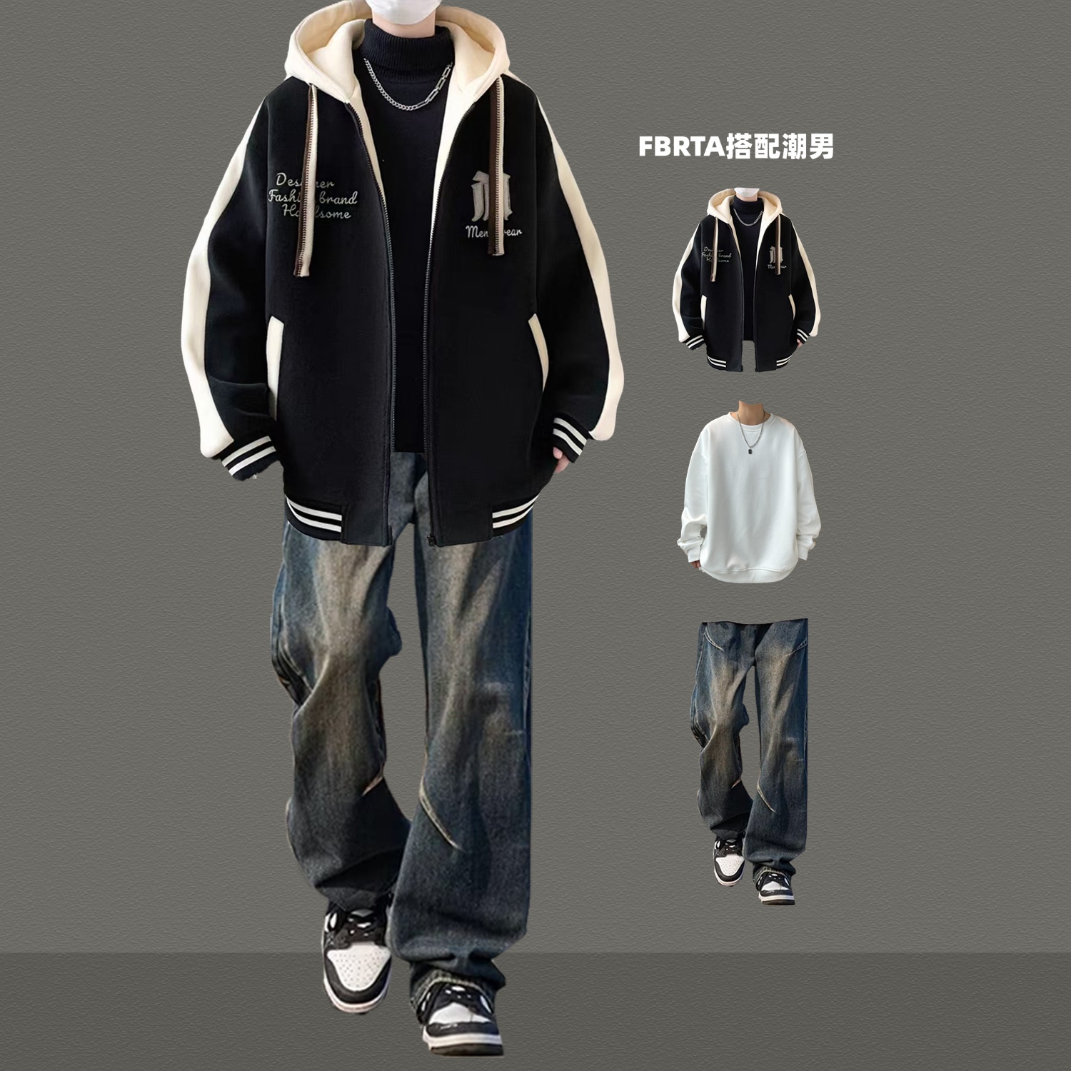 潮流初高中生连帽棒球服男生套装宽松日常夹克外套青春帅气三件套