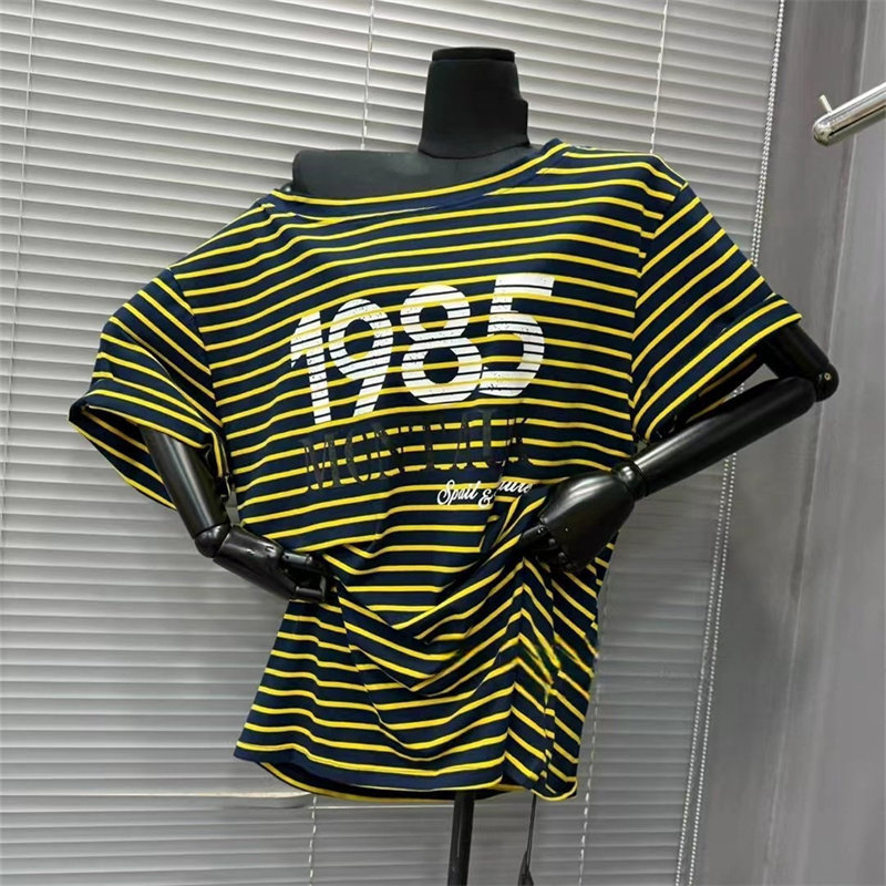 宽松条纹撞色字母印花短袖T上衣