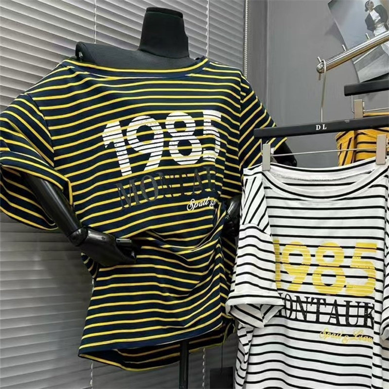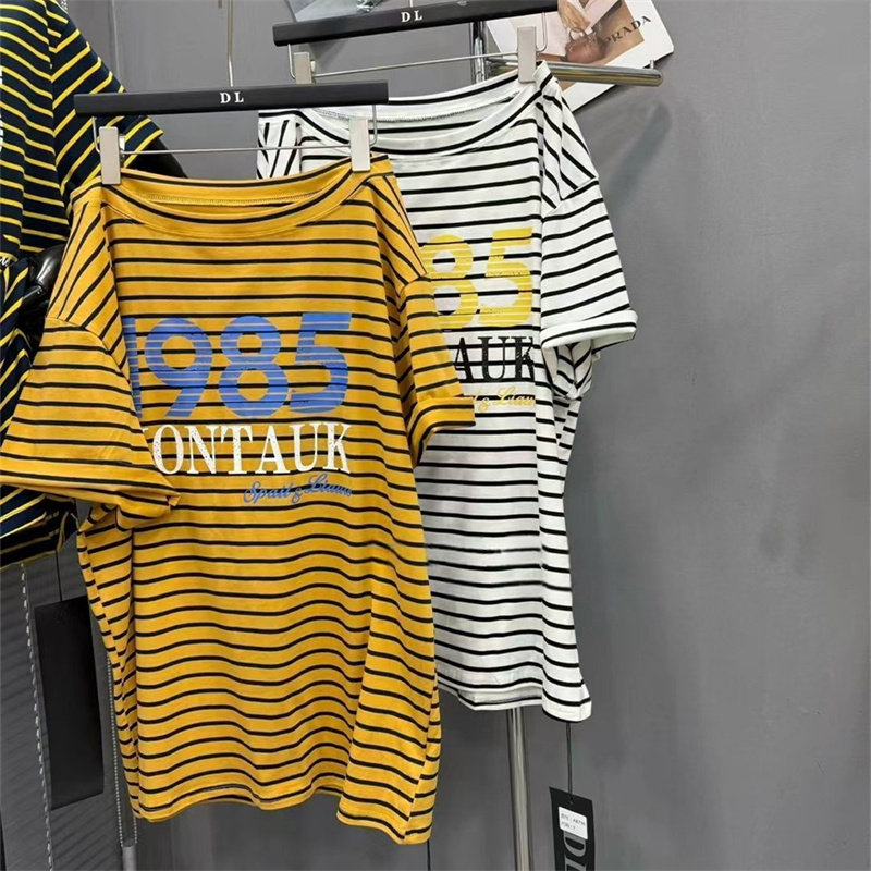 特价韩国东大门夏季宽松显瘦休闲短袖T恤女条纹撞色字母印花上衣