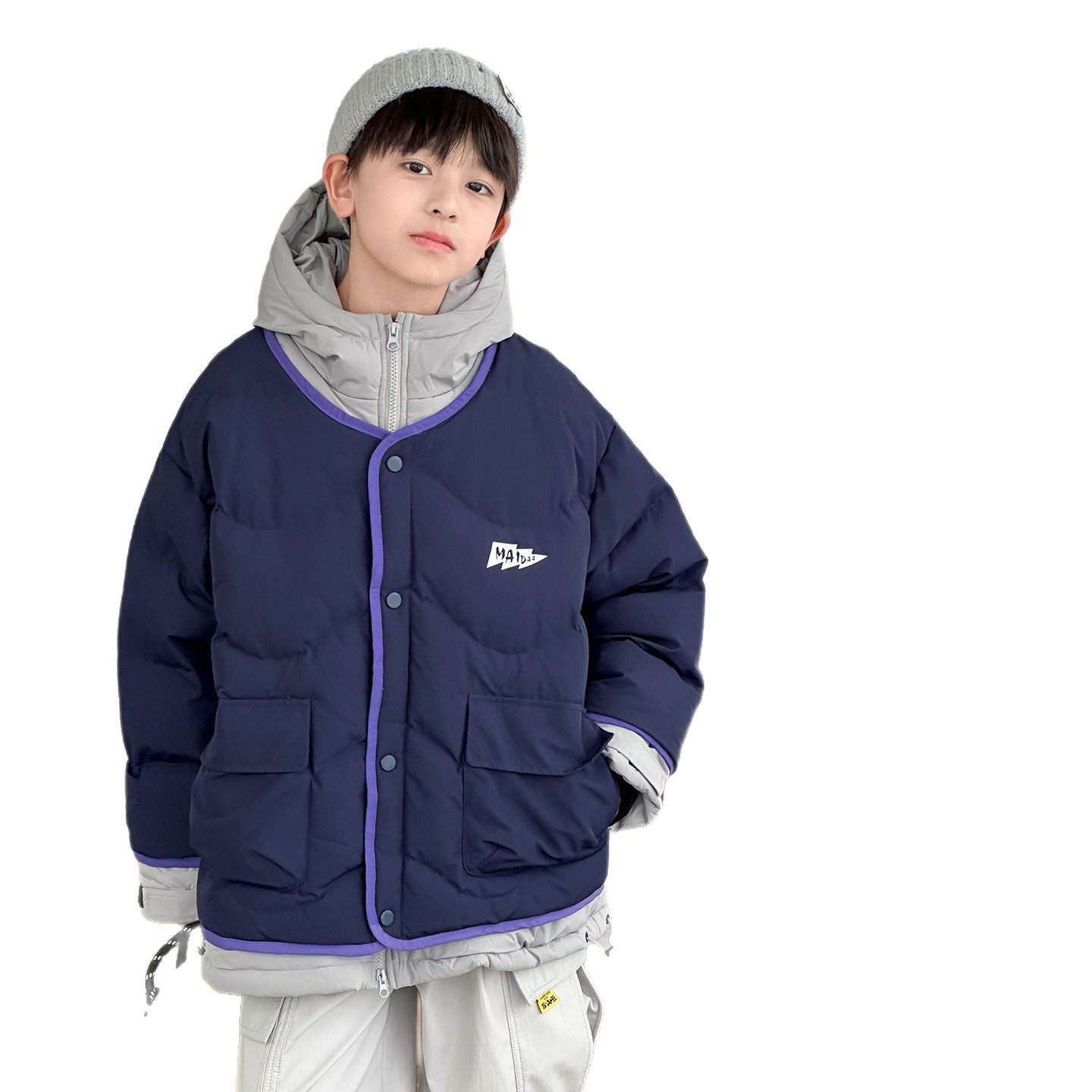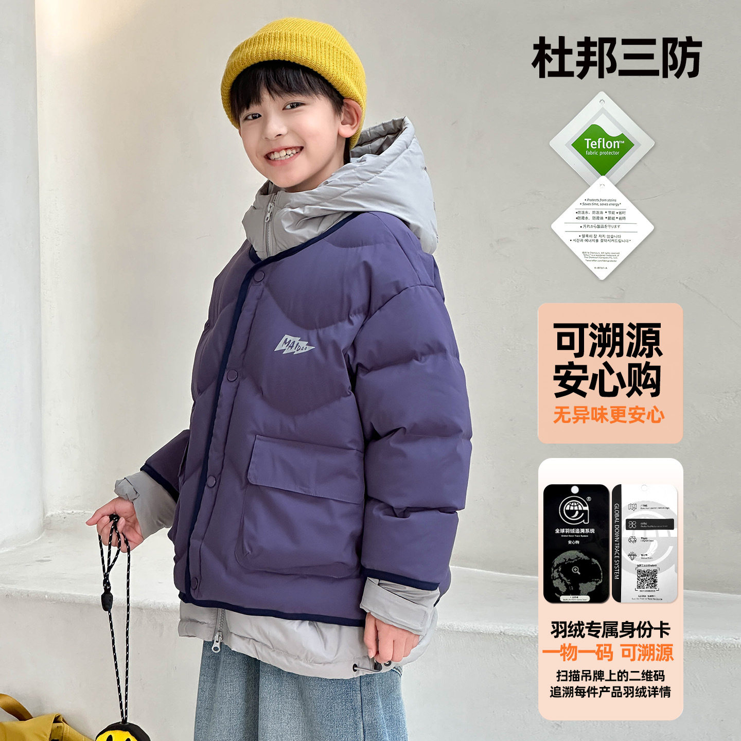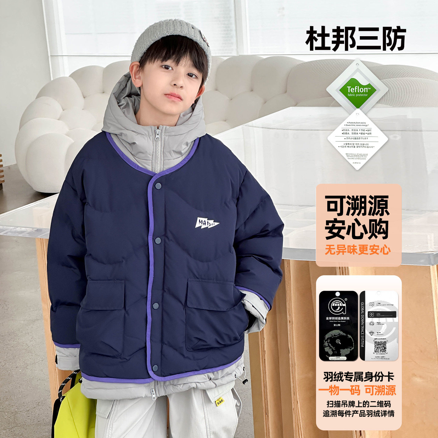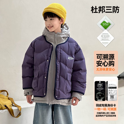 2025冬装可溯源90白鸭绒撞色假两件儿童羽绒服男女童羽绒外套批发