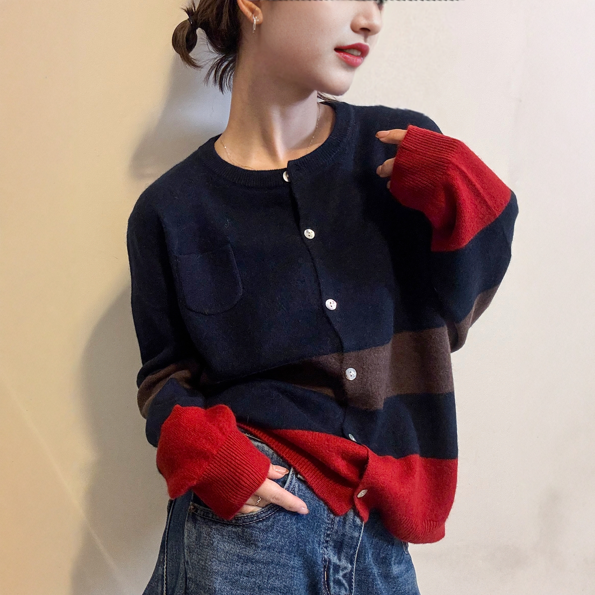 撞色条纹羊毛针织开衫女欧洲站2025冬装新款欧货女装毛衣打底衫潮