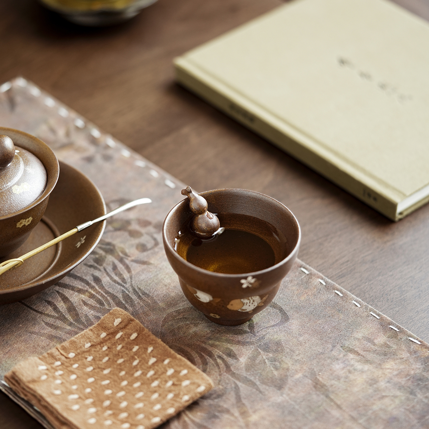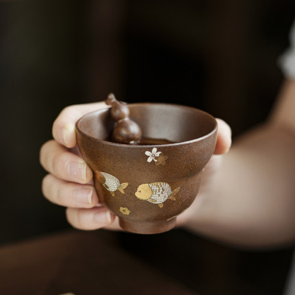 老岩泥花鱼嬉葫芦主人杯粗陶茶杯