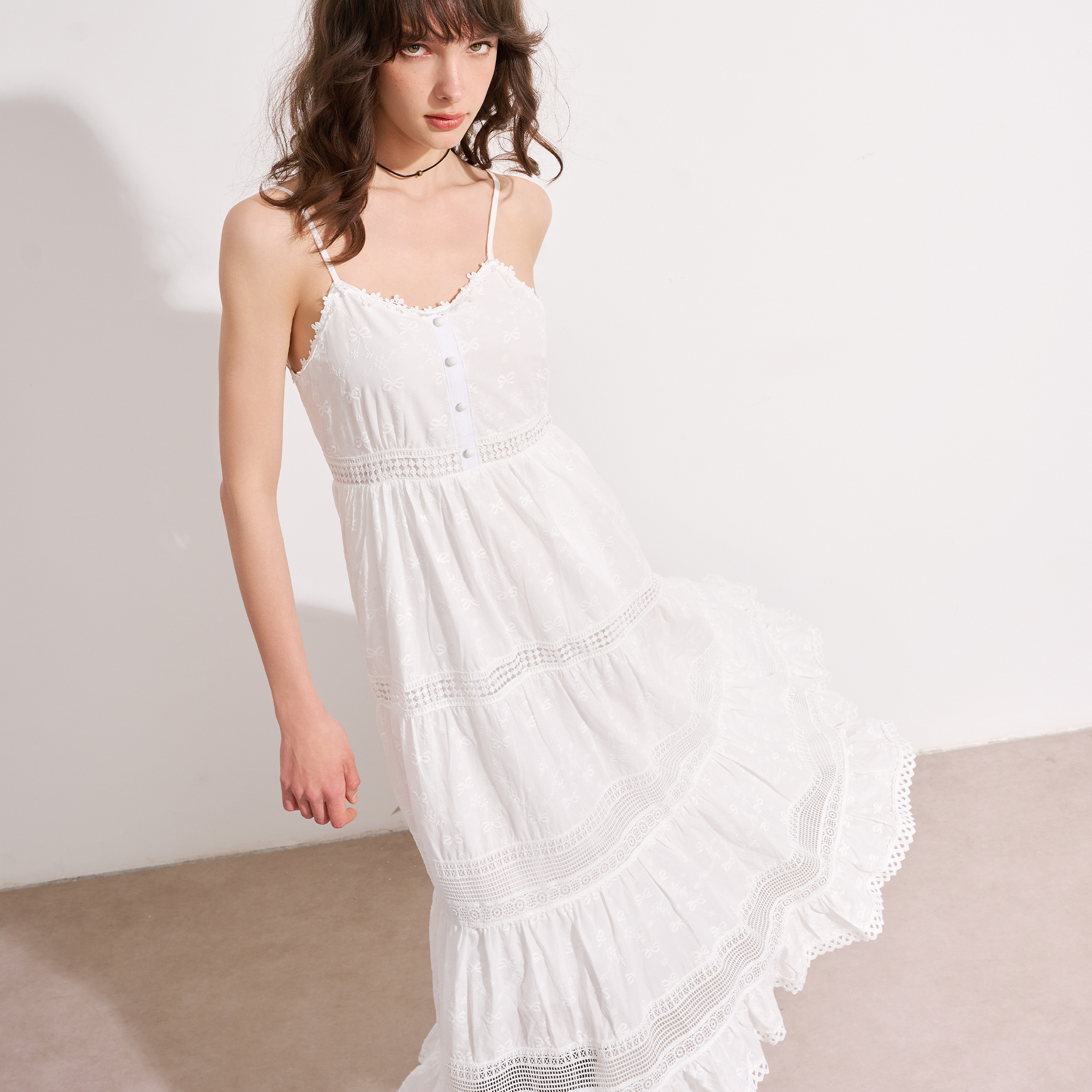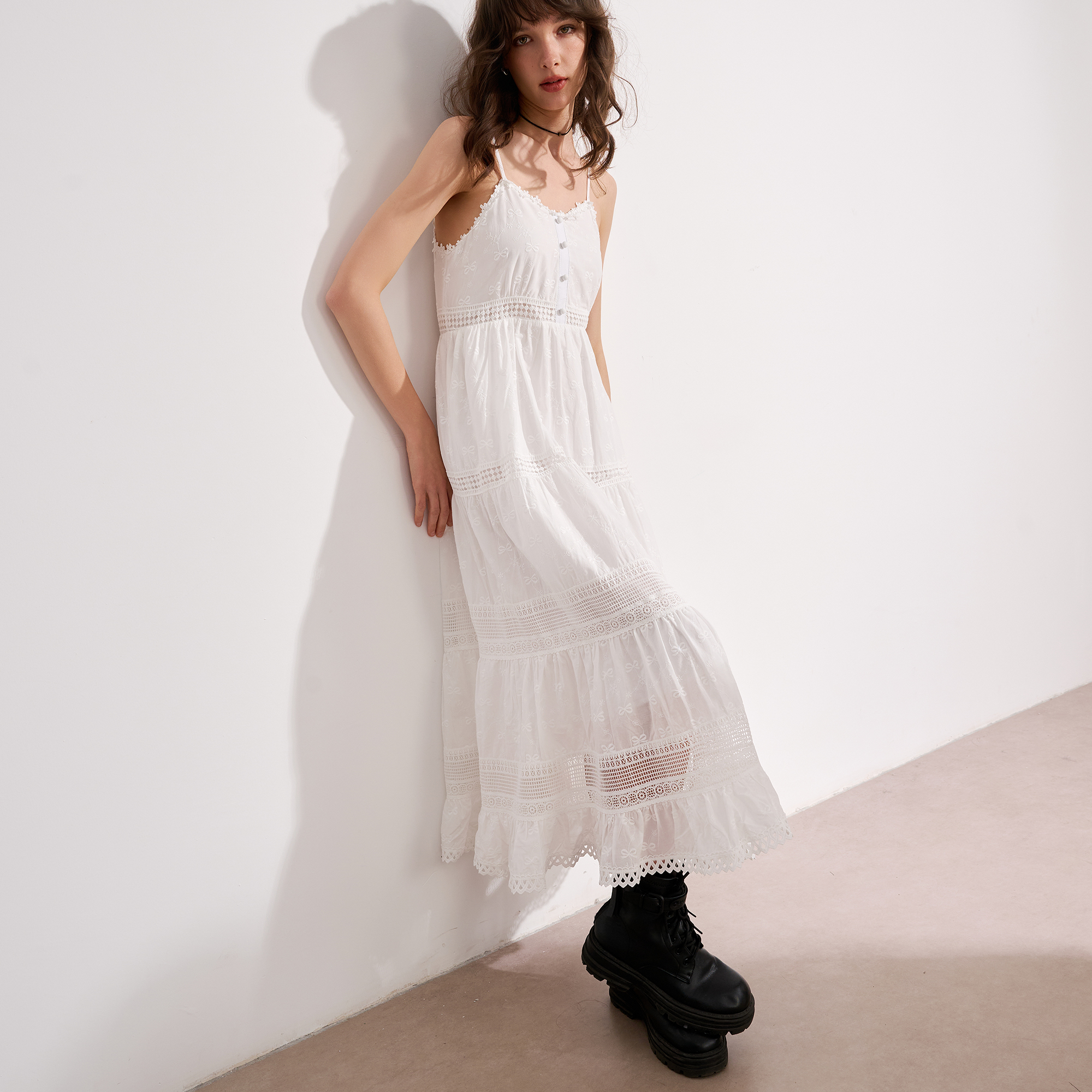 Basic House/百家好度假风白色吊带沙滩裙女2025夏镂空花边连衣裙