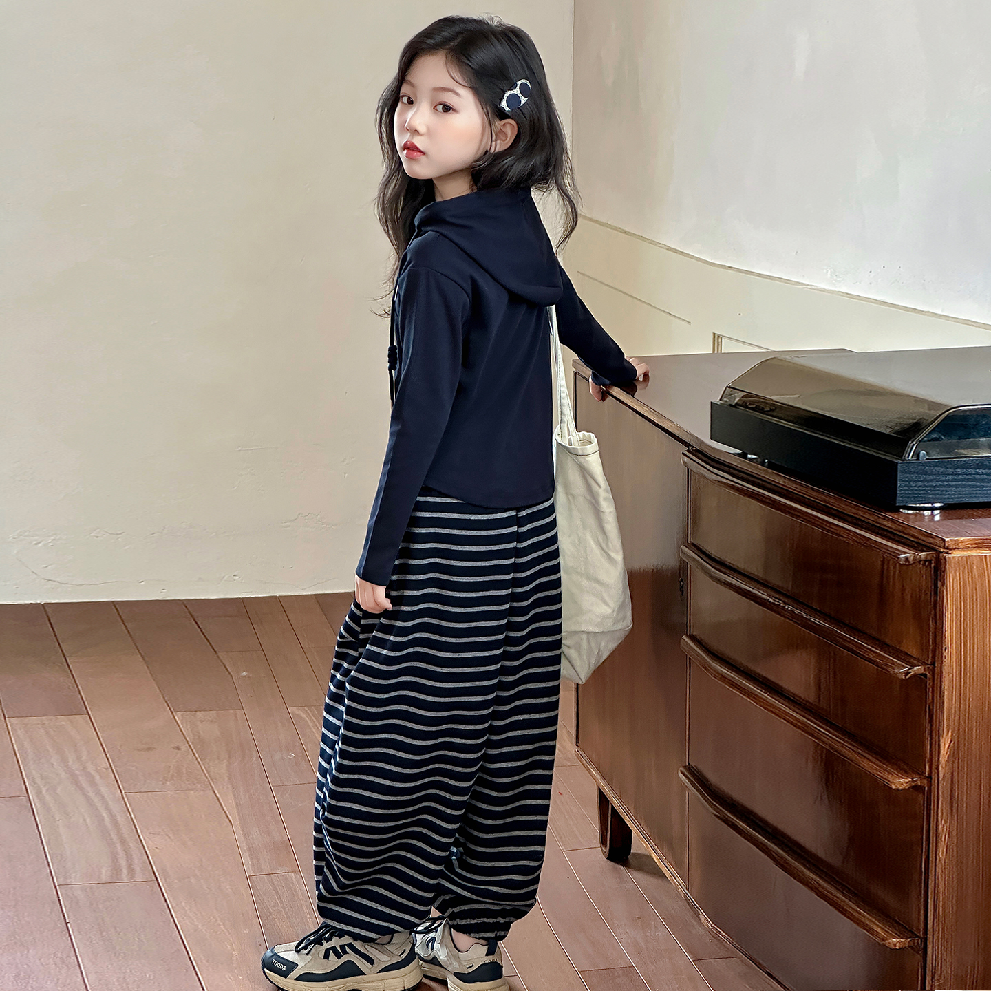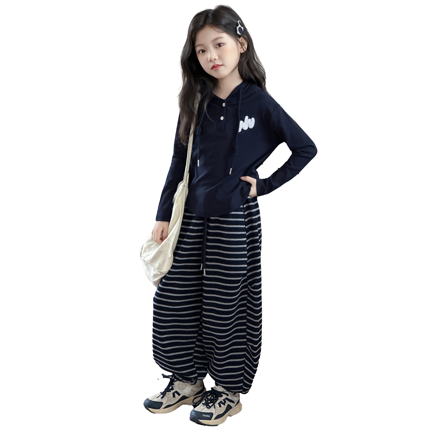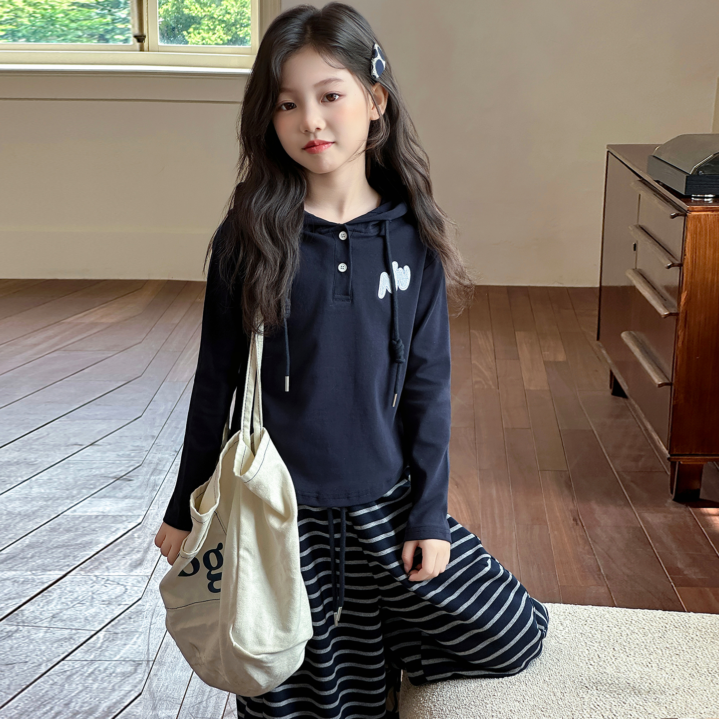 女童套装秋季2025新款洋气儿童连帽卫衣女孩秋装韩版条纹裤两件套