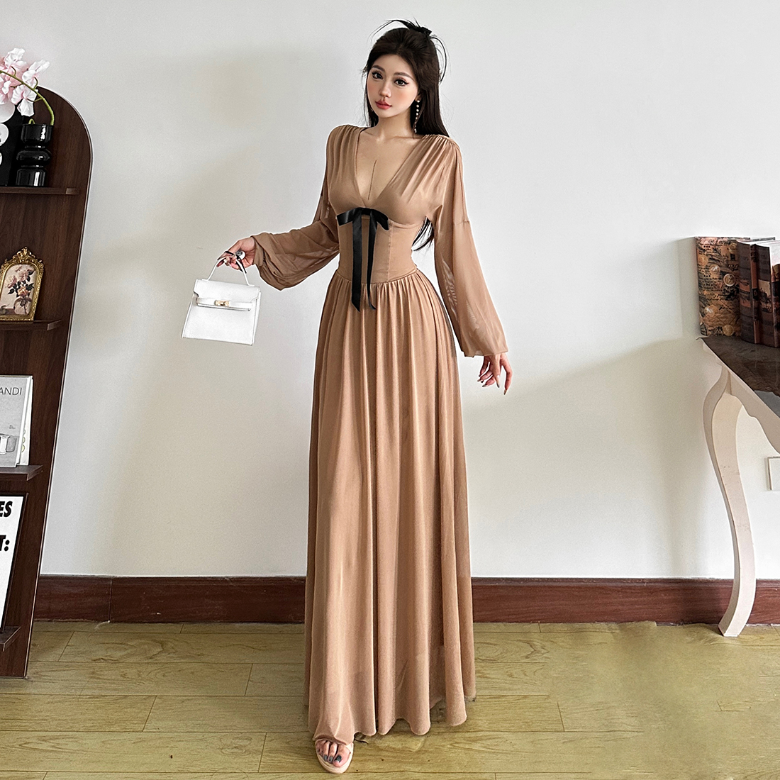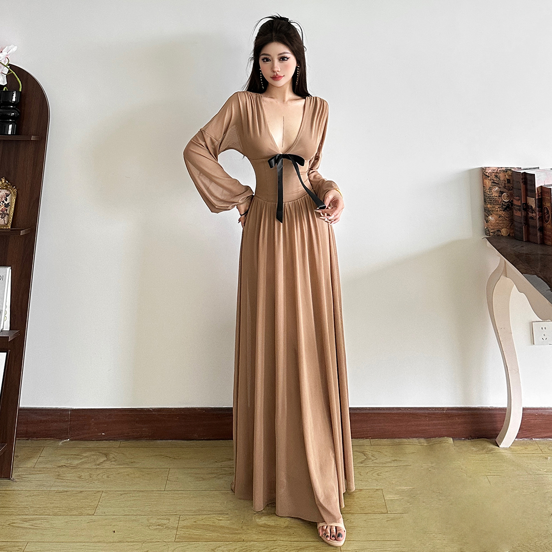 仙女蝴蝶结V领百搭长袖连衣裙