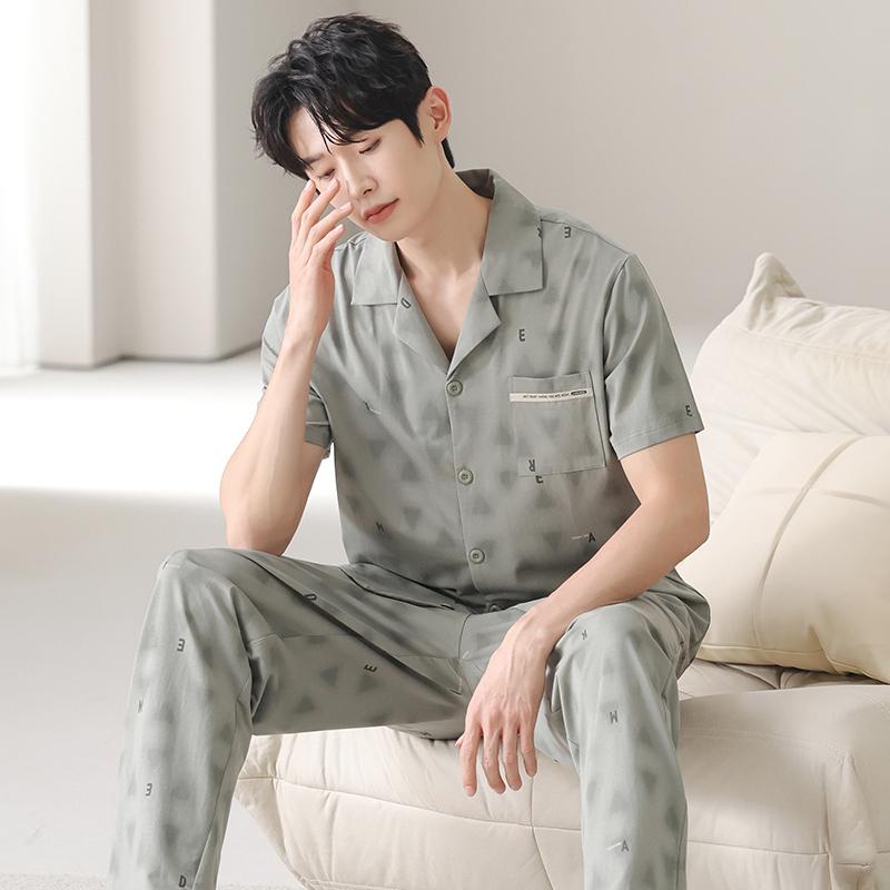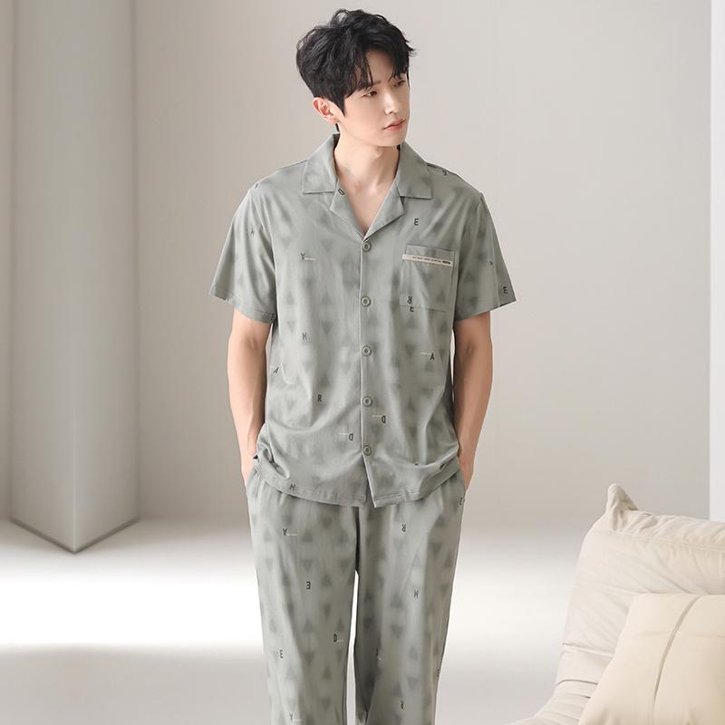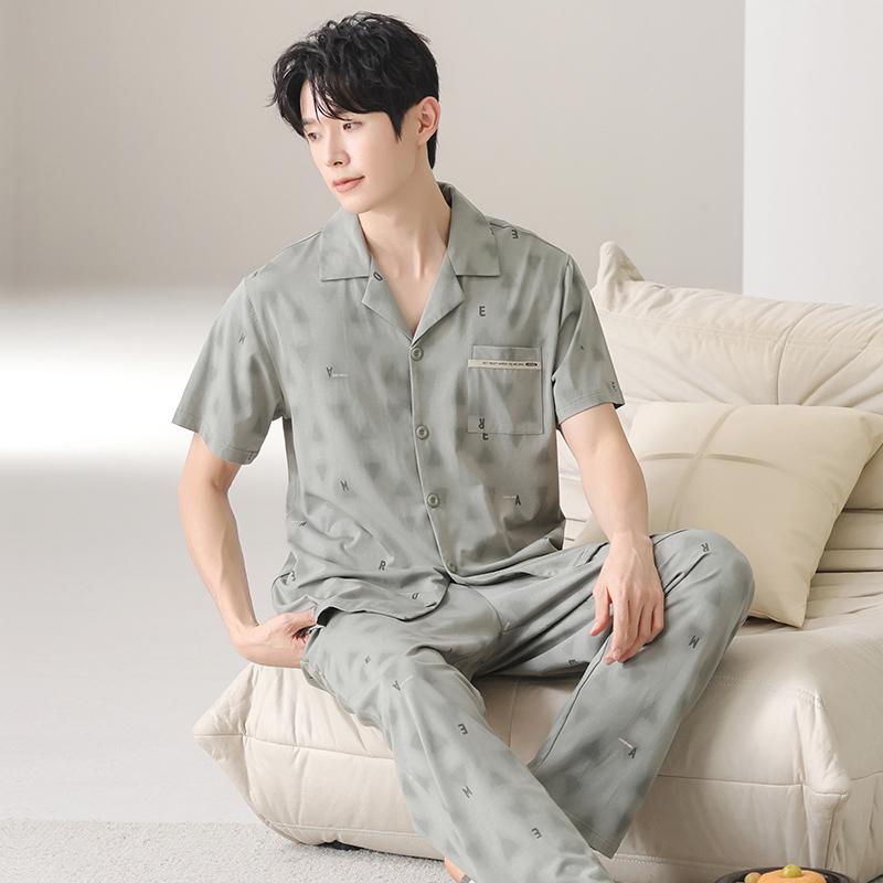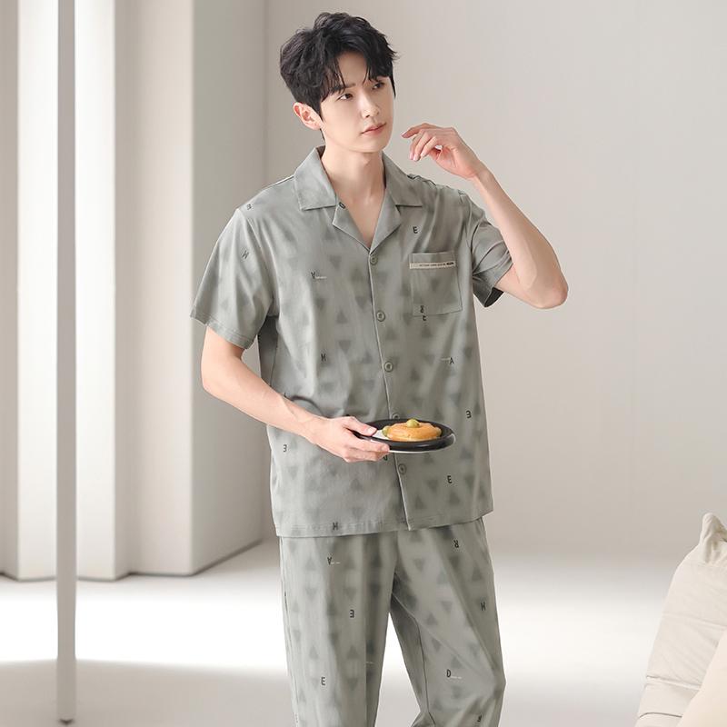 汕蝶25年睡衣男士春夏季翻领莱赛尔棉短袖长裤家居服简约大码套装