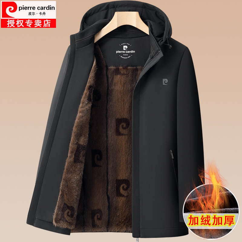 皮尔卡丹冬季外套男加绒加厚夹克可拆连帽中老年爸爸装金貂绒棉服