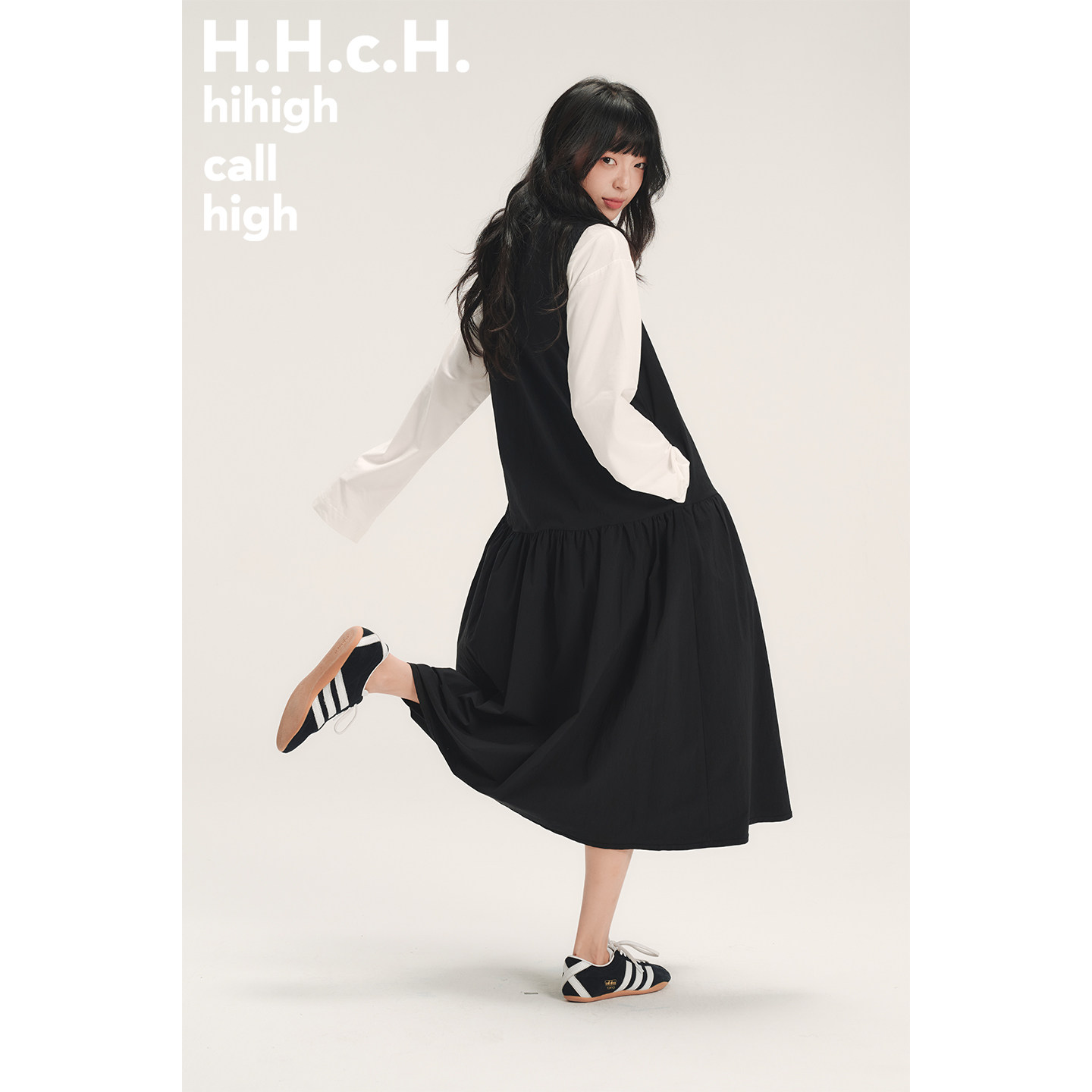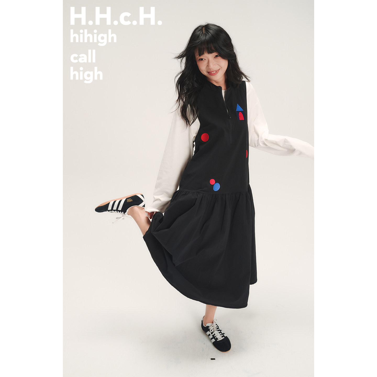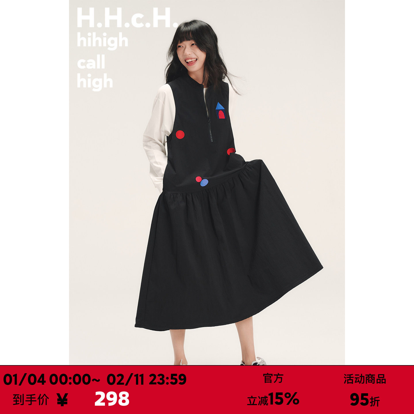 HHCH口海 AW25 彩色小房子波点绣花半开领黑色长款无袖连衣裙