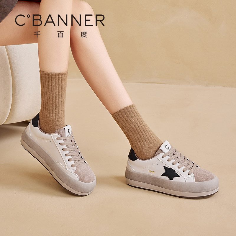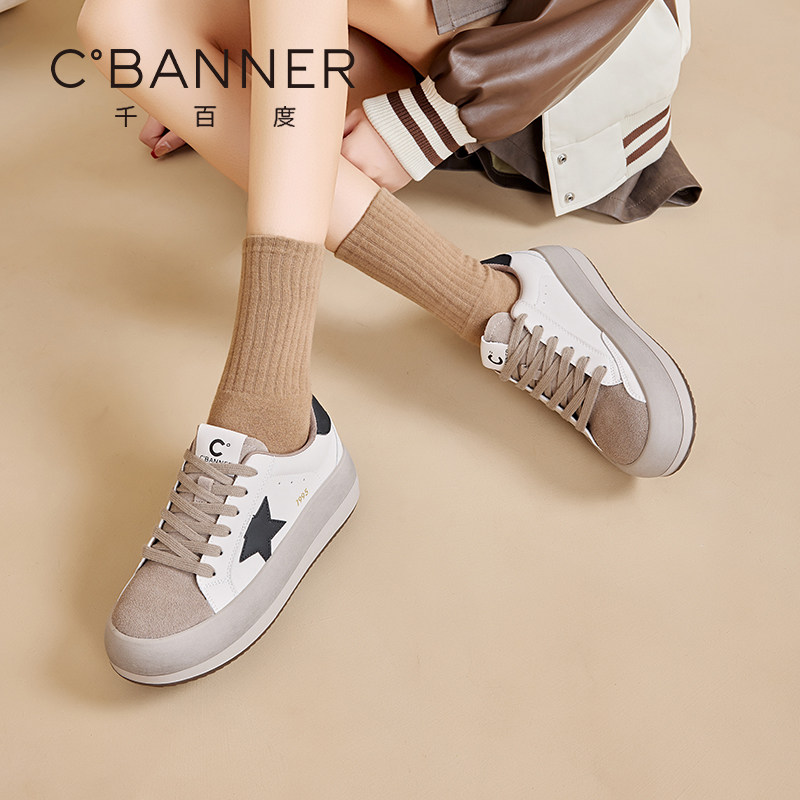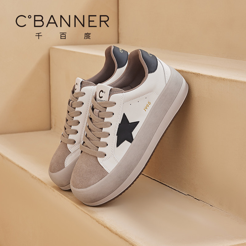 千百度休闲鞋女新款真皮复古拼色款潮流时尚五角星星系带百搭板鞋