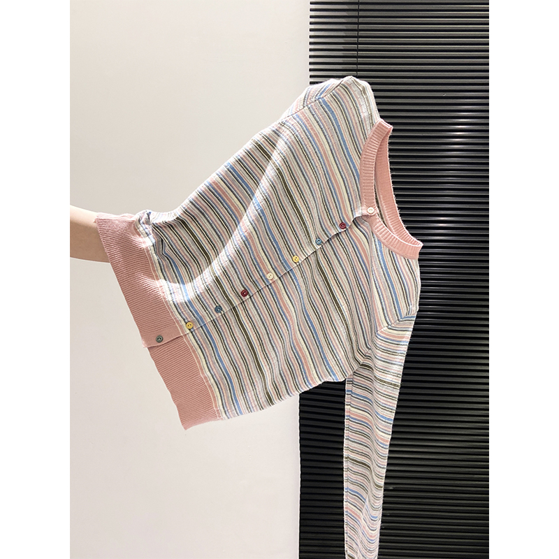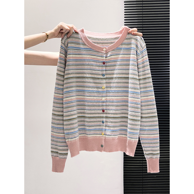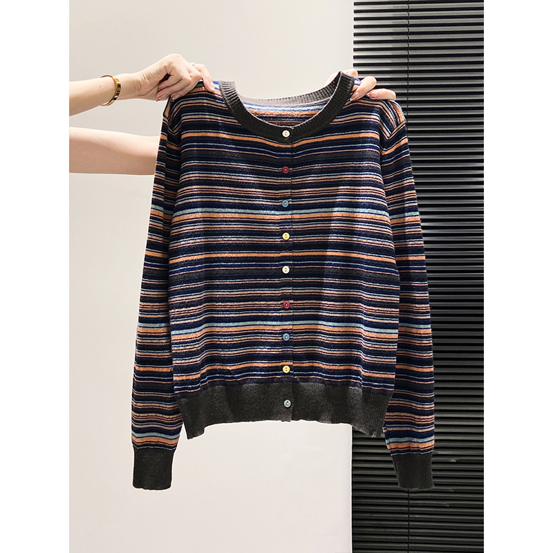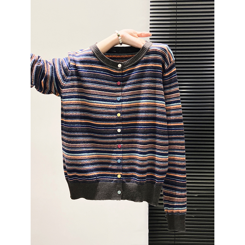 撞色条纹圆领设计感长袖针织开衫女秋季新款宽松毛衣慵懒风小上衣