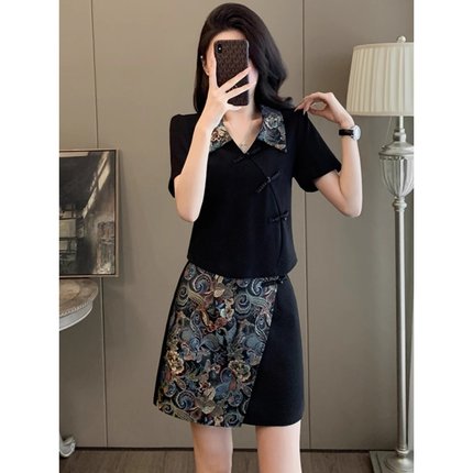 外贸清仓捡漏新中式国风时尚套装女夏季气质短袖显瘦短裙两件套潮
