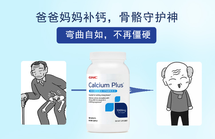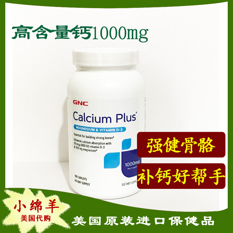 保税26.7 美国GNC高含量碳酸钙片1000mg180粒钙镁D 补钙健骨 骨质