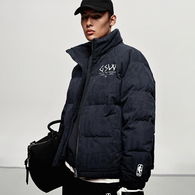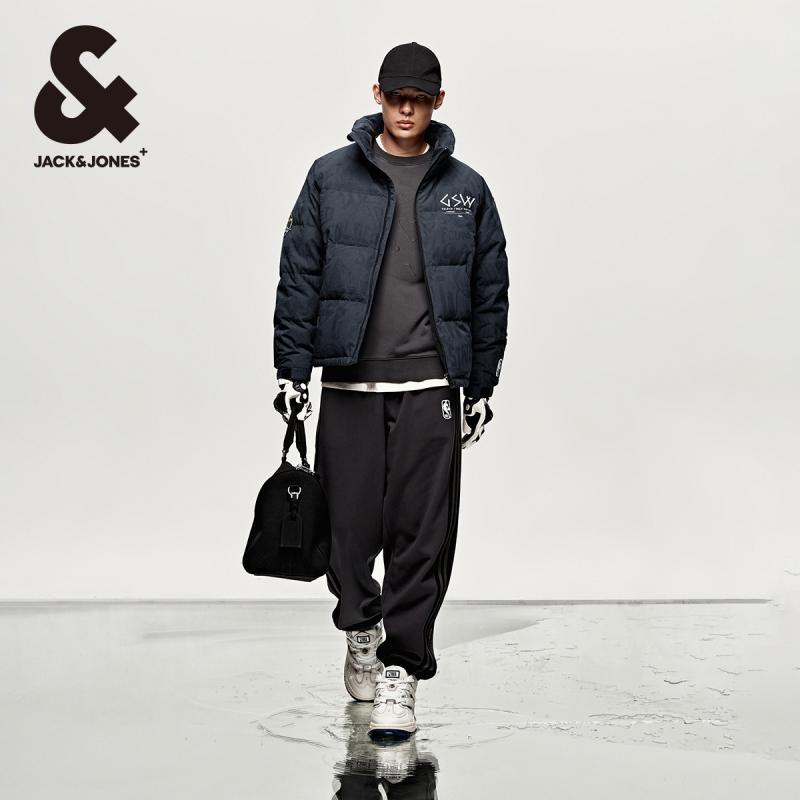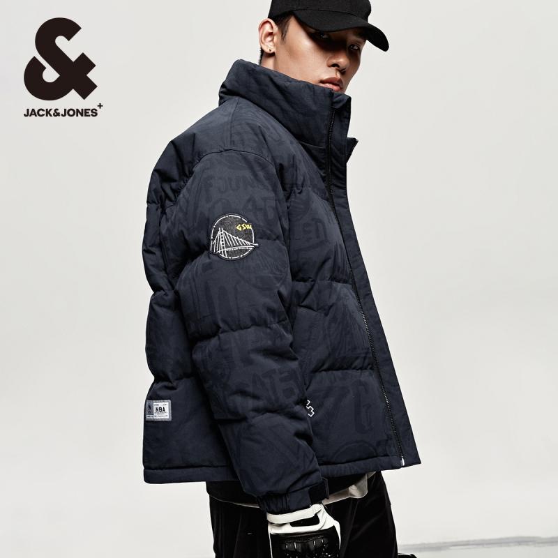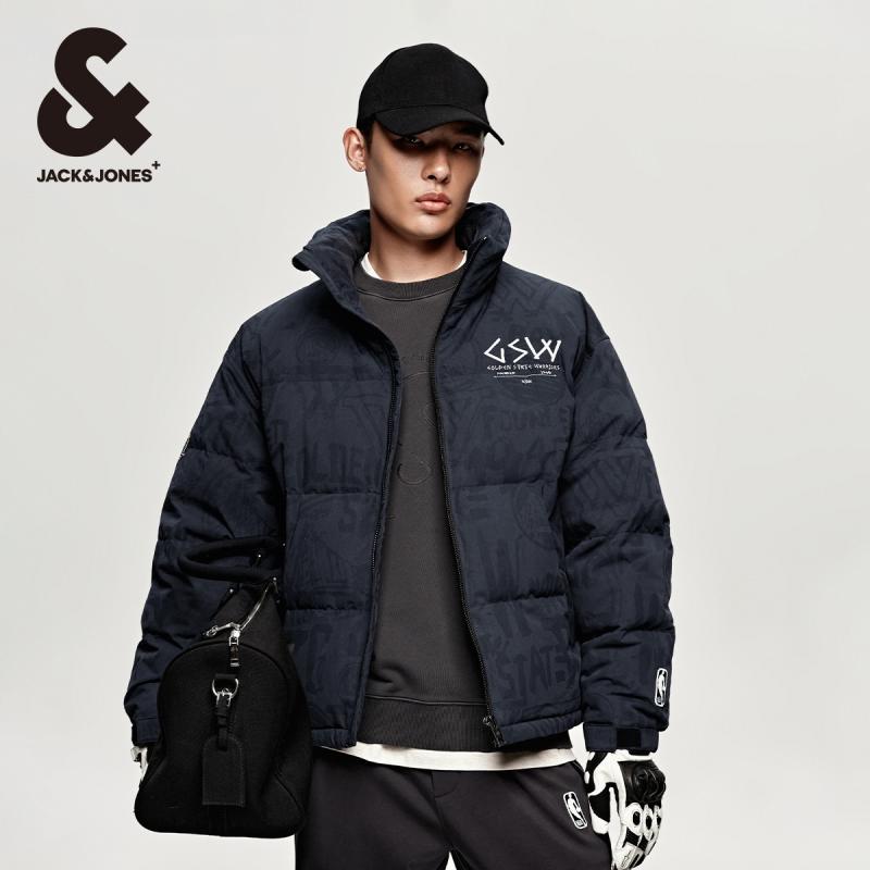 杰克琼斯NBA联名勇士队冬季无帽立领刺绣装饰宽松羽绒服外套男装