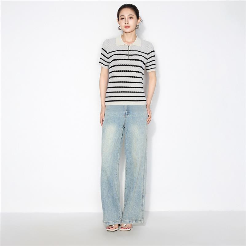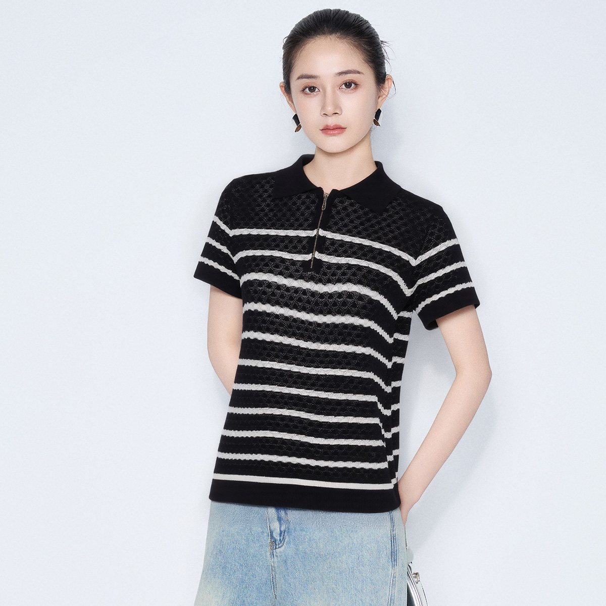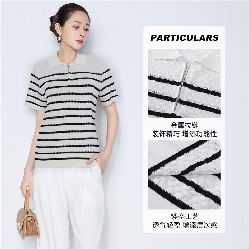 马天奴2025春夏新款黑白条纹提花针织衫翻领短袖小衫上衣时尚气质