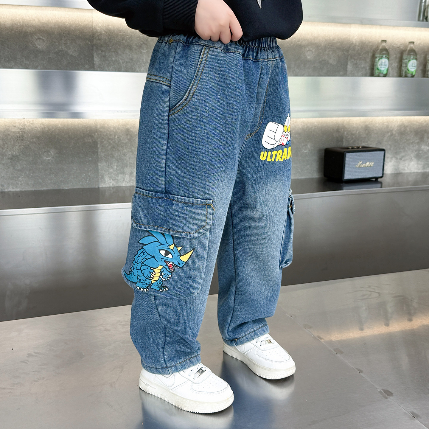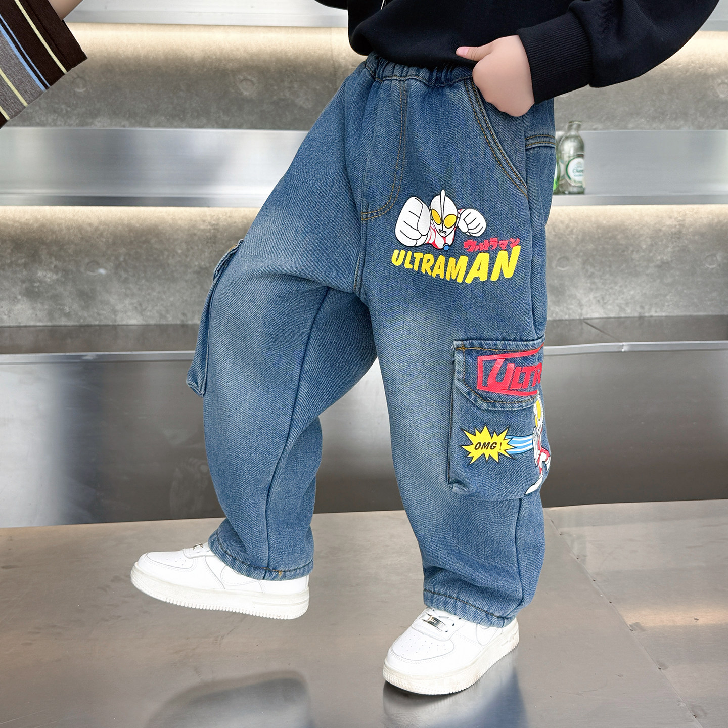 男童加绒牛仔裤秋冬2025新款宝宝儿童装冬装奥特曼一体绒加厚棉裤