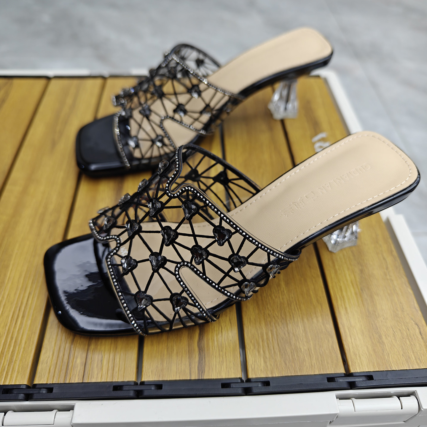 透明水钻一字拖女2026夏季新款仙女风水晶跟露趾凉拖鞋细跟高跟鞋