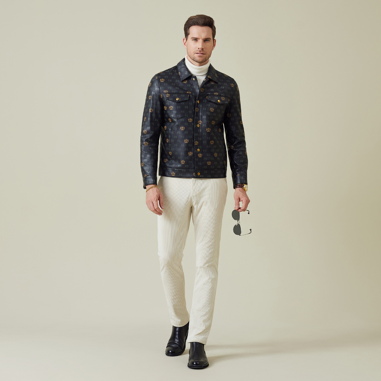 雷迪波尔男装真皮皮衣2025秋季新款满身印花绵羊皮翻领皮夹克外套
