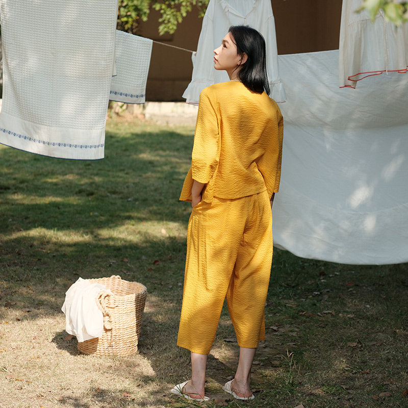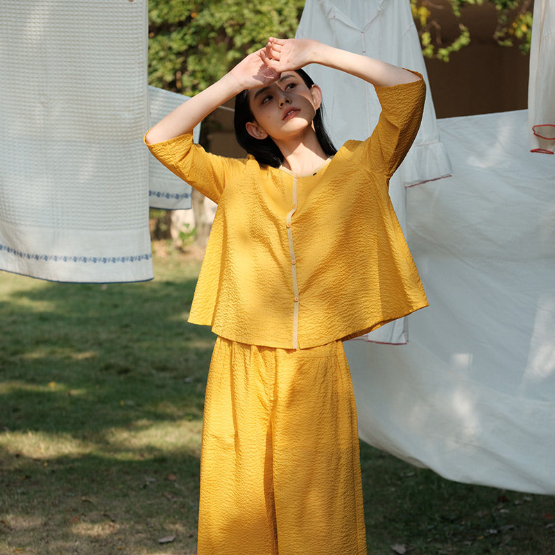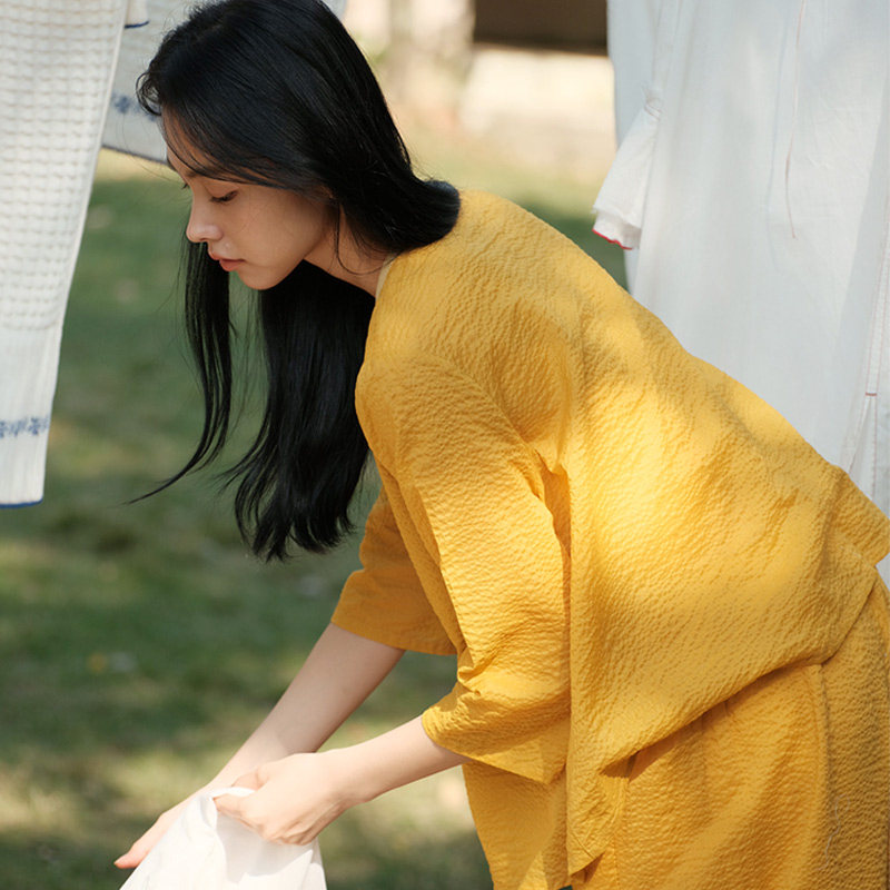 朵朵可可睡衣女2026春夏季新款纯棉盐缩简约中袖七分裤家居服