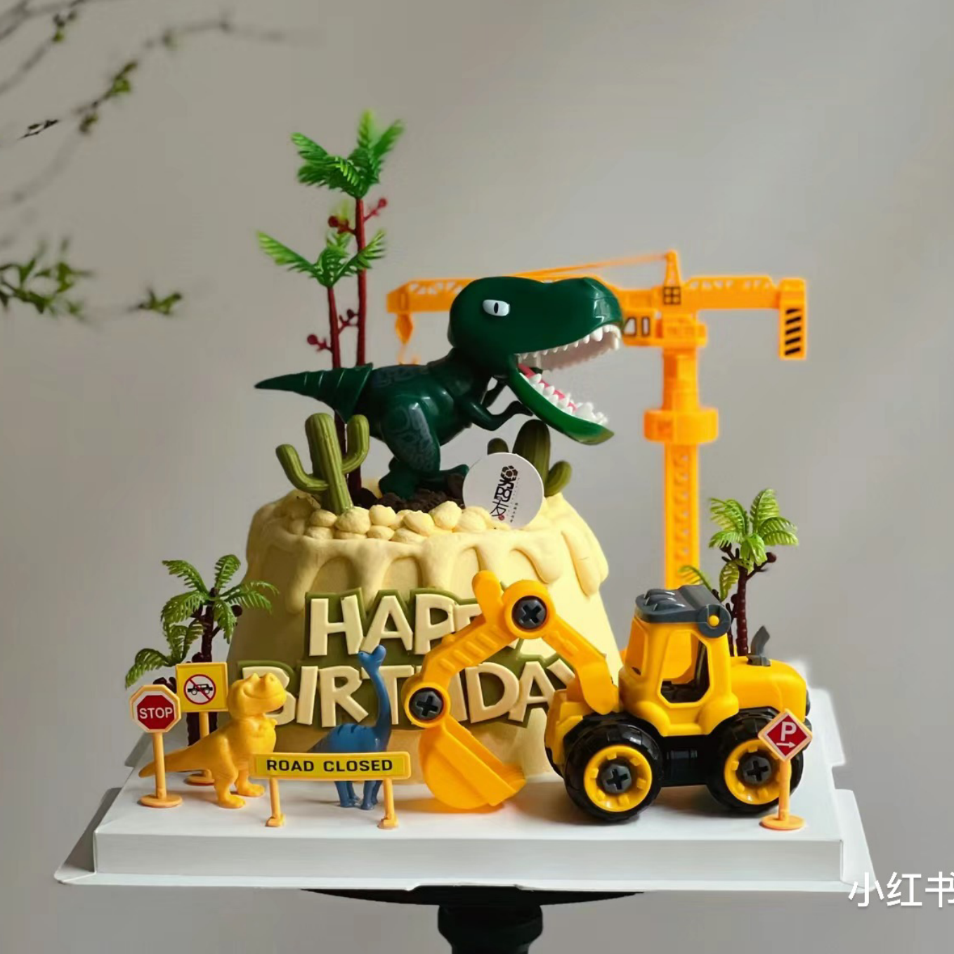 男孩卡通挖掘机生日蛋糕装饰摆件儿童工程车霸王龙大恐龙烘焙插件