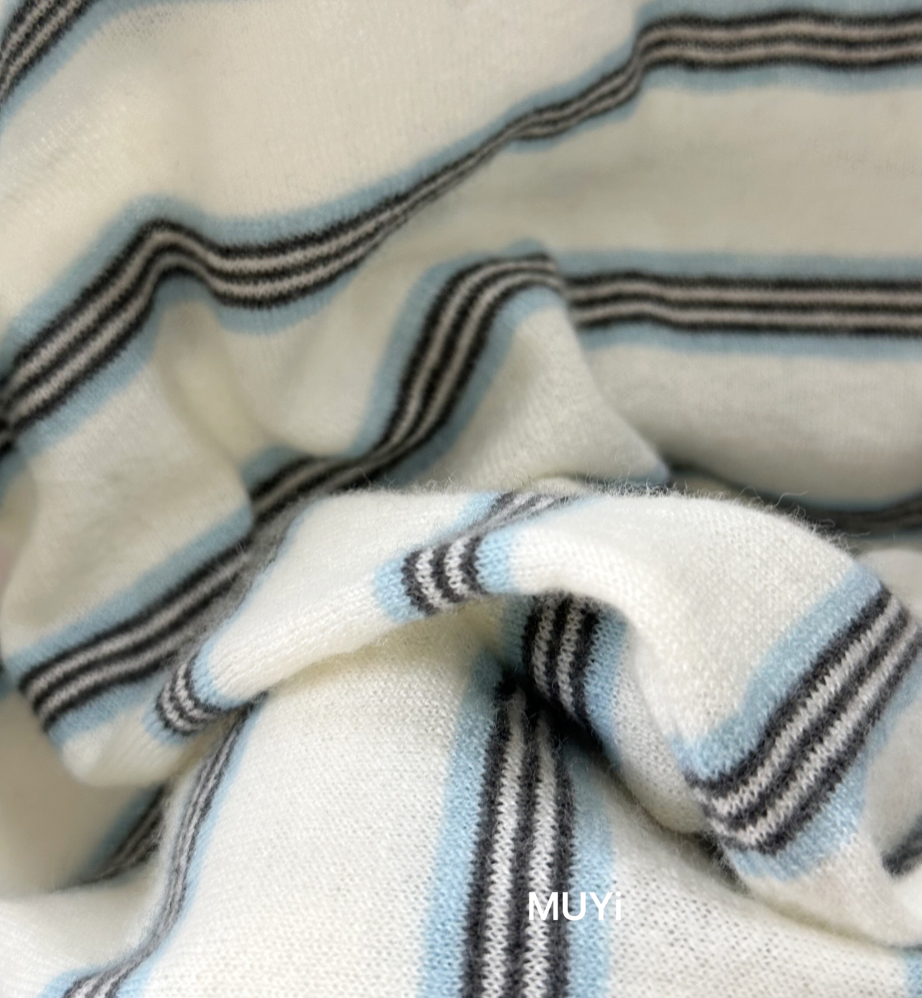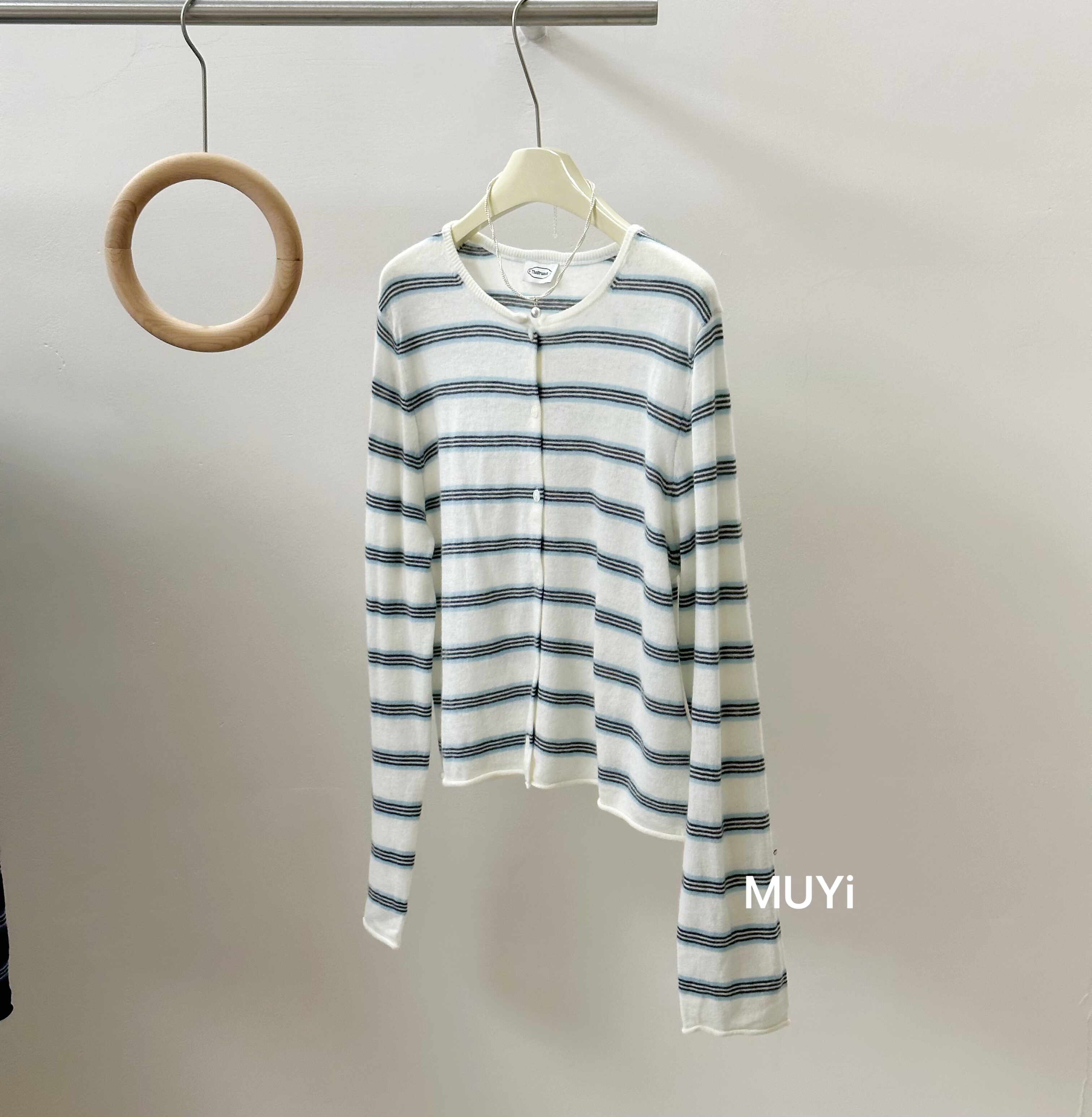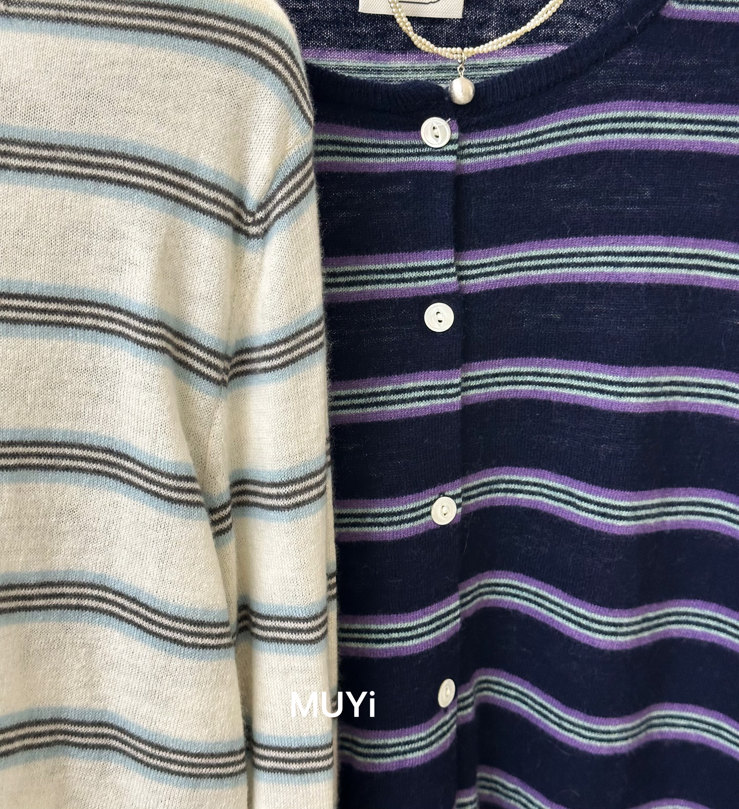 MUYI/韩版简约百搭条纹圆领长袖针织衫女宽松显瘦短宽毛衣开衫