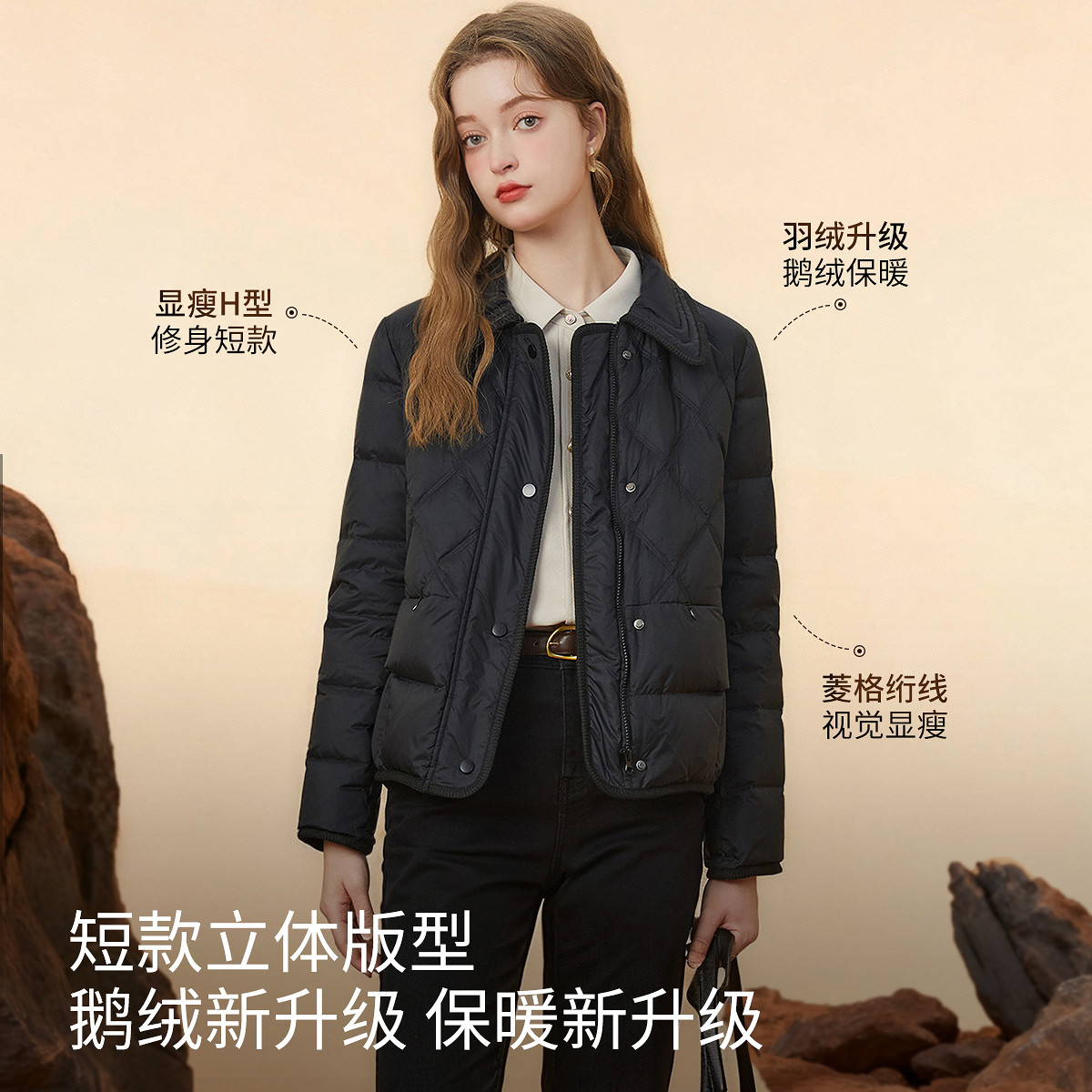 KBNE长袖短款米色轻薄羽绒服2025冬季新款圆领防风保暖外套秋冬女