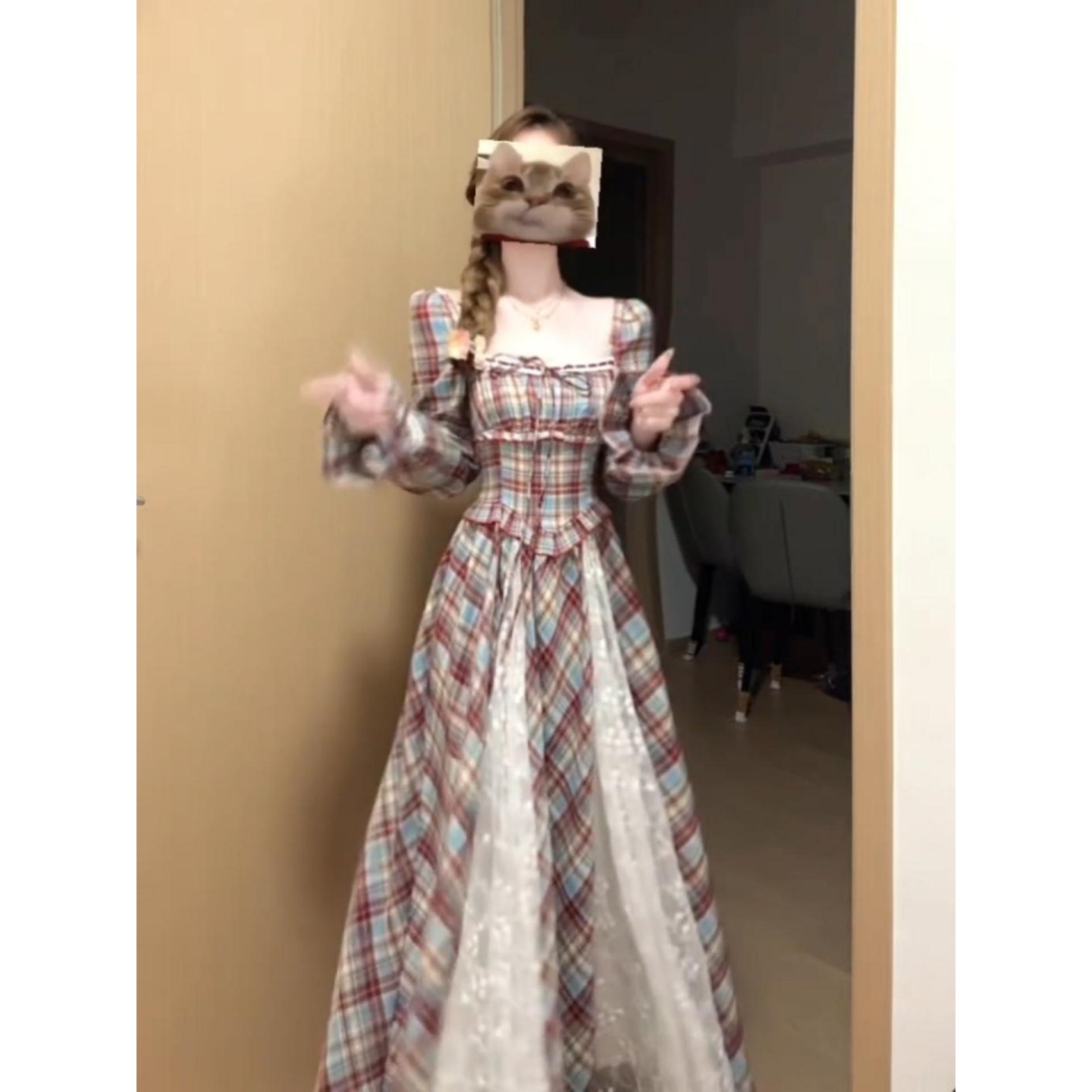大码胖mm法式复古格纹连衣裙女秋季长袖方领蕾丝拼接收腰绝美长裙