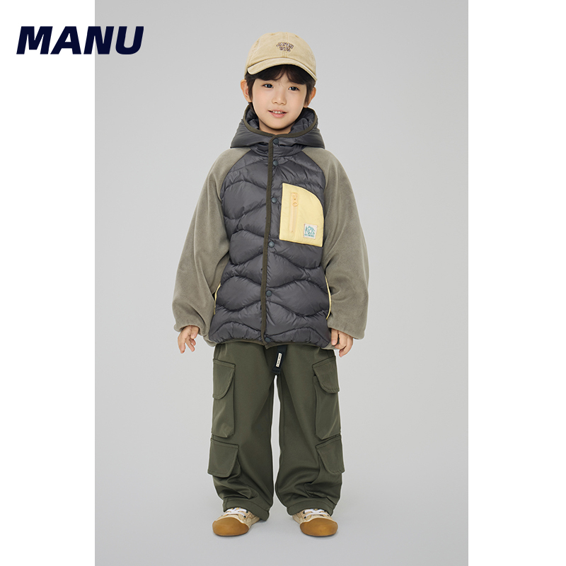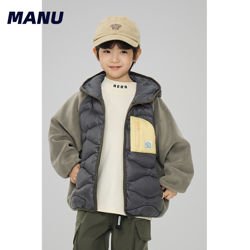 MANUKIDS童装男童24冬季90白鸭绒撞色拼接保暖连帽儿童羽绒服外套