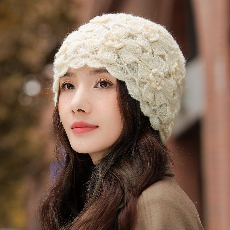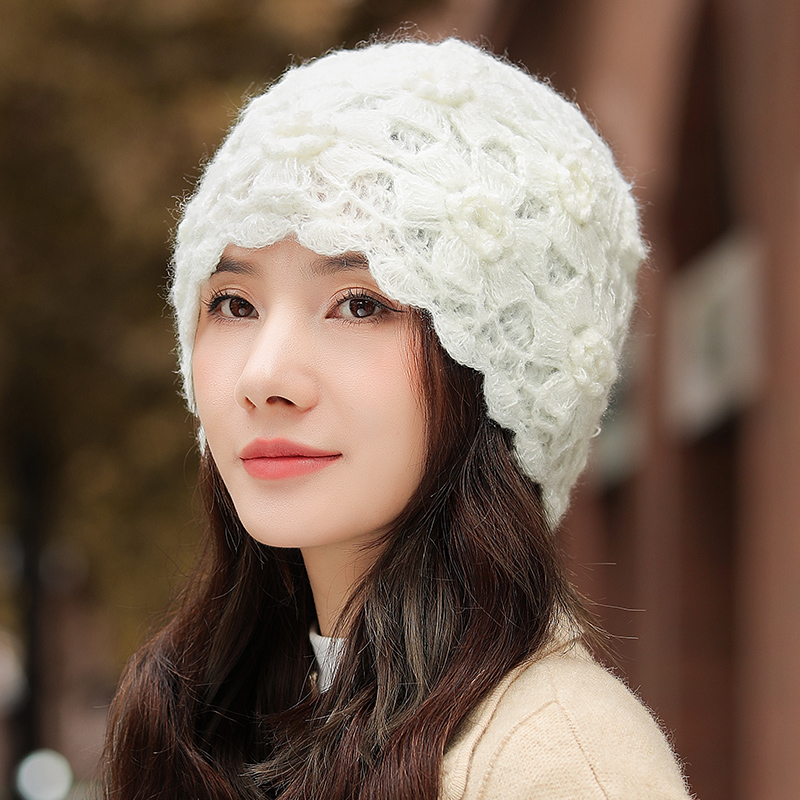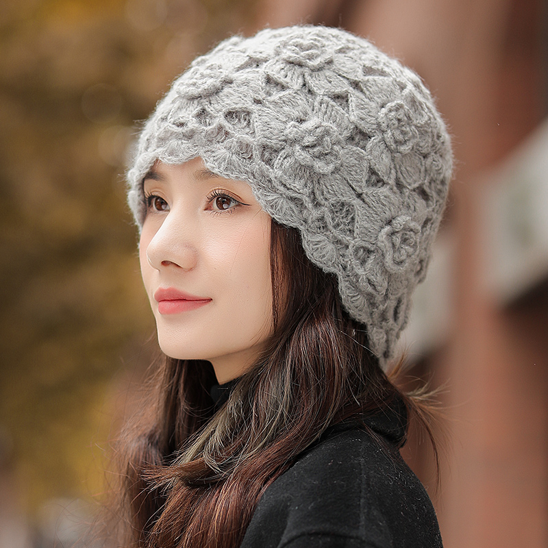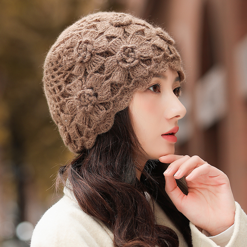 帽子女士秋冬2025新款包头毛线帽保暖洋气针织帽手工钩花遮白发帽