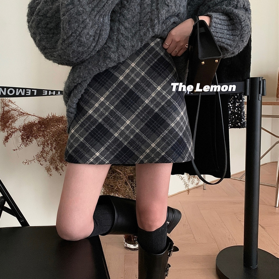 复古格子毛呢半身裙女秋季大码胖mm显瘦梨形a字包臀短裙直筒裙子