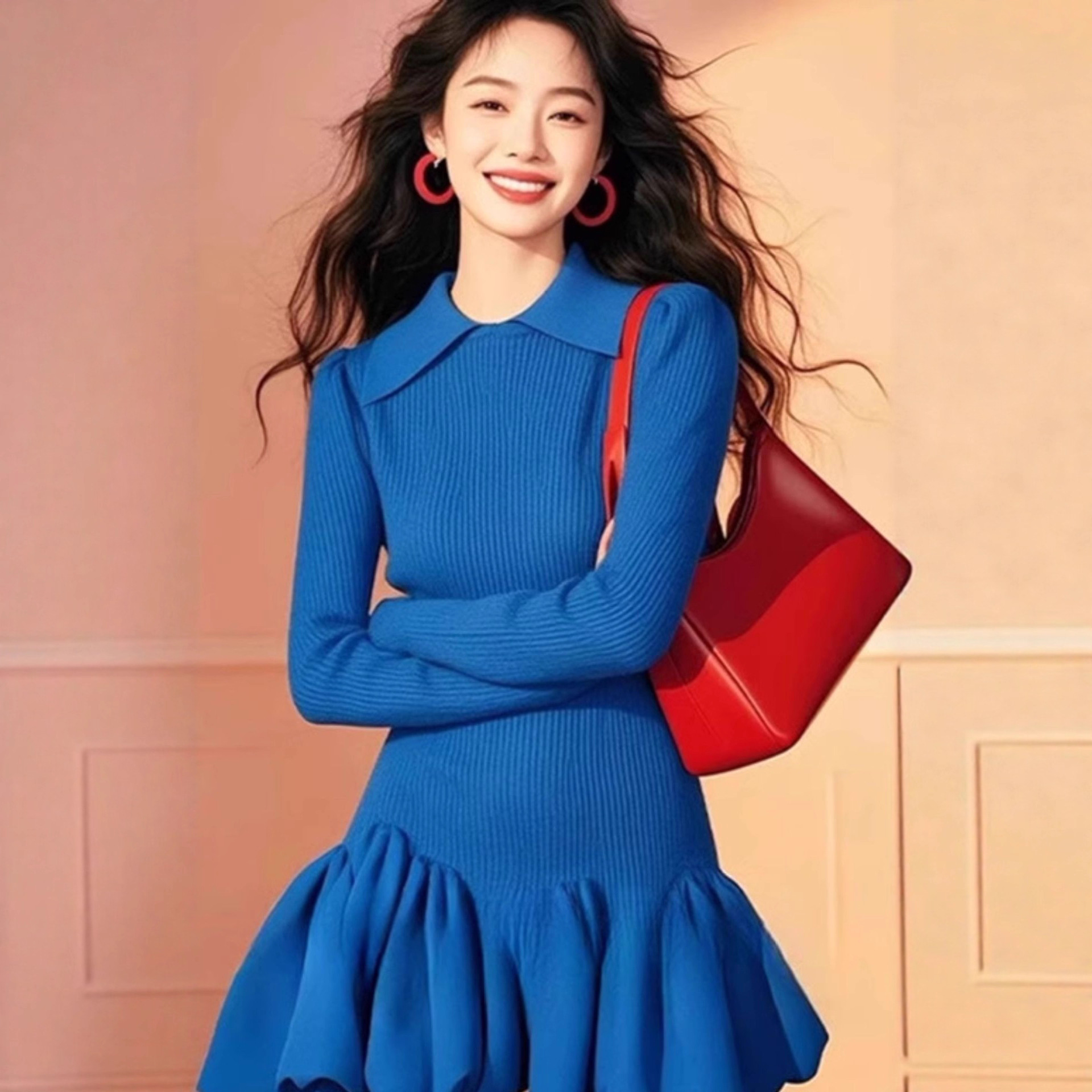 翻领A字短裙拼接收腰小个子蓝色针织毛衣连衣裙女秋冬内搭打底裙