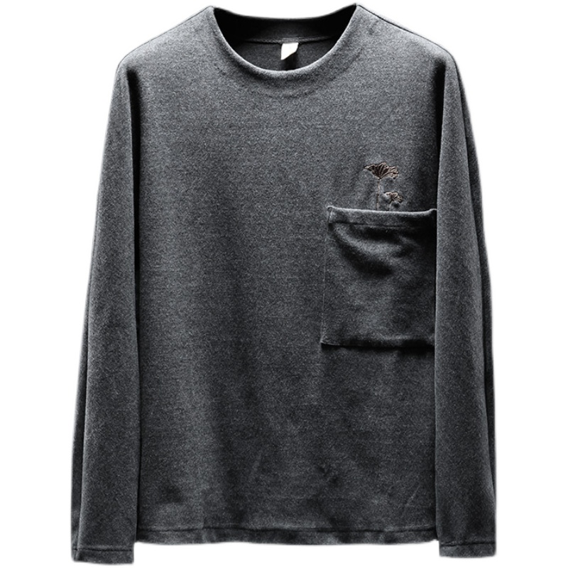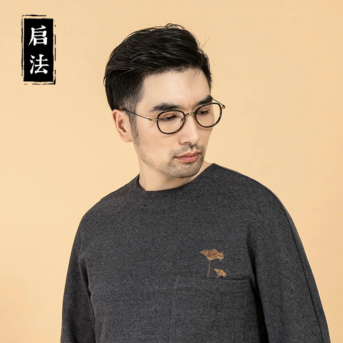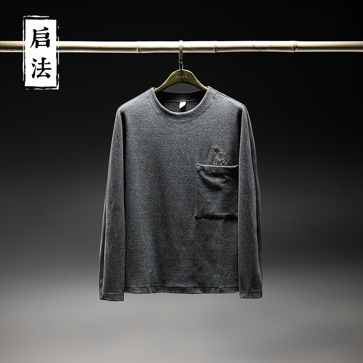 启法原创男装圆领打底衫男士春季内搭中国风磨毛刺绣长袖T恤男厚