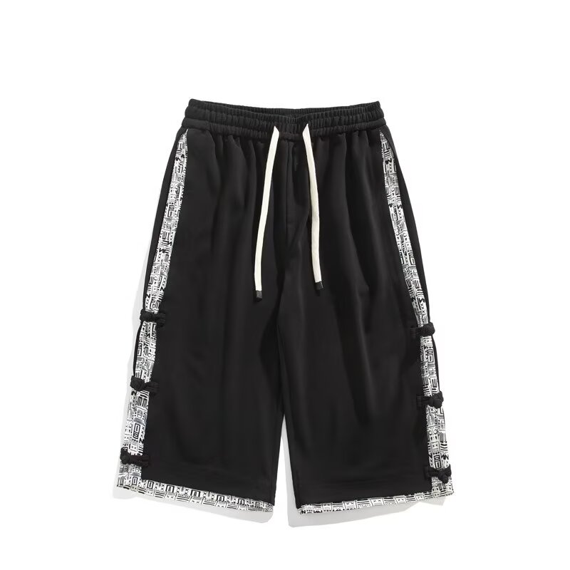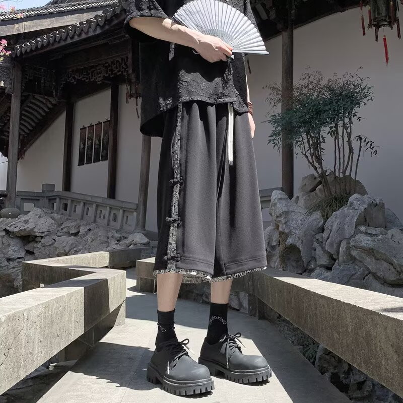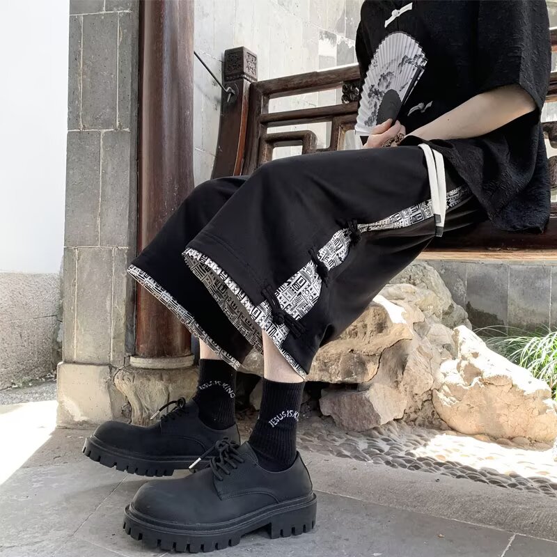 新中式假两件七分裤男夏季潮牌宽松过膝短裤潮流国风六分7分裤子