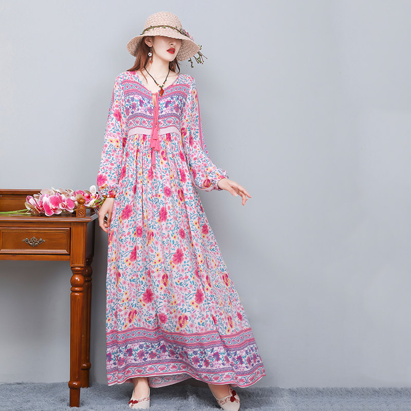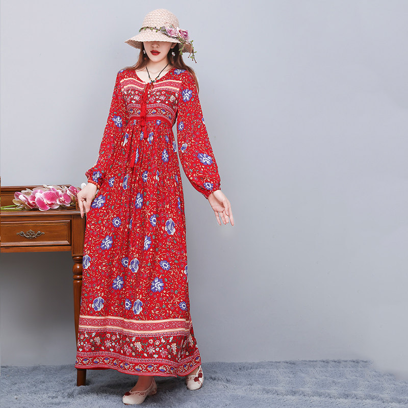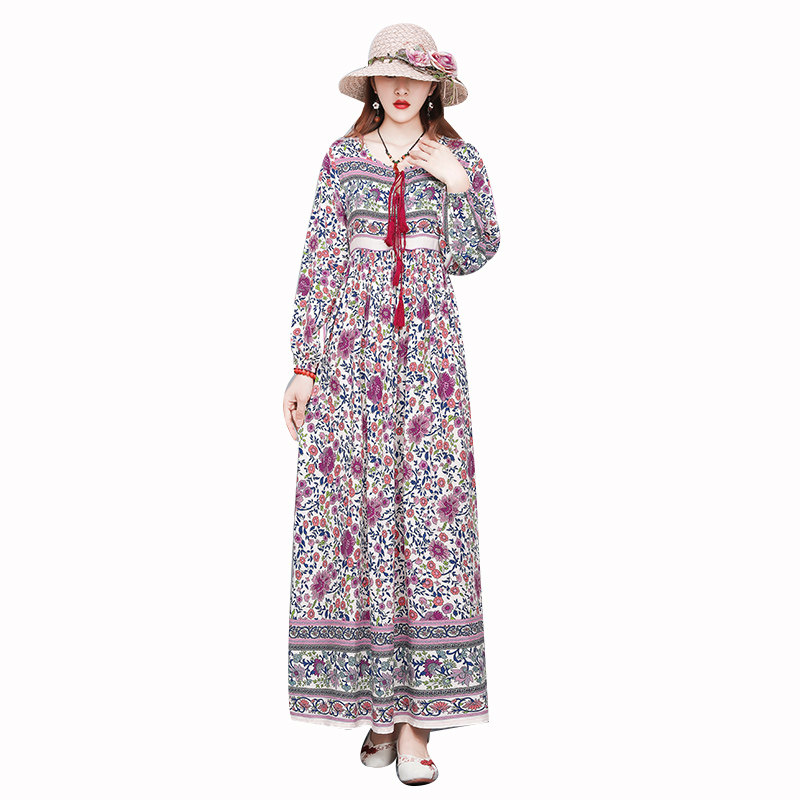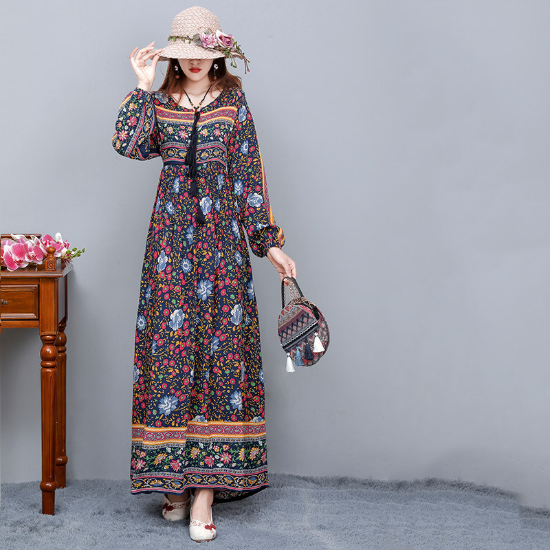 包邮民族风棉质印花连衣裙女春夏季长款大摆裙宽松波西米亚长裙子