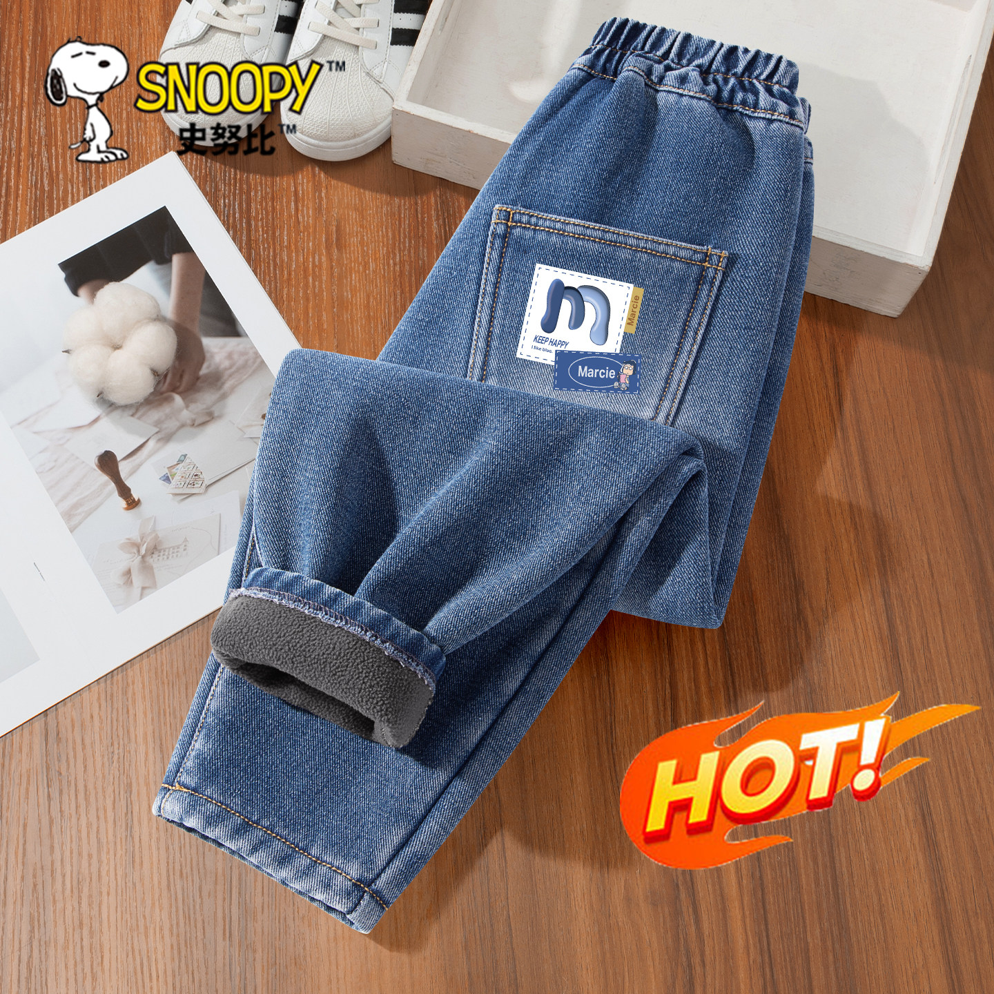 史努比男童加绒牛仔裤秋冬男孩保暖长裤2025新款冬装儿童加厚裤子