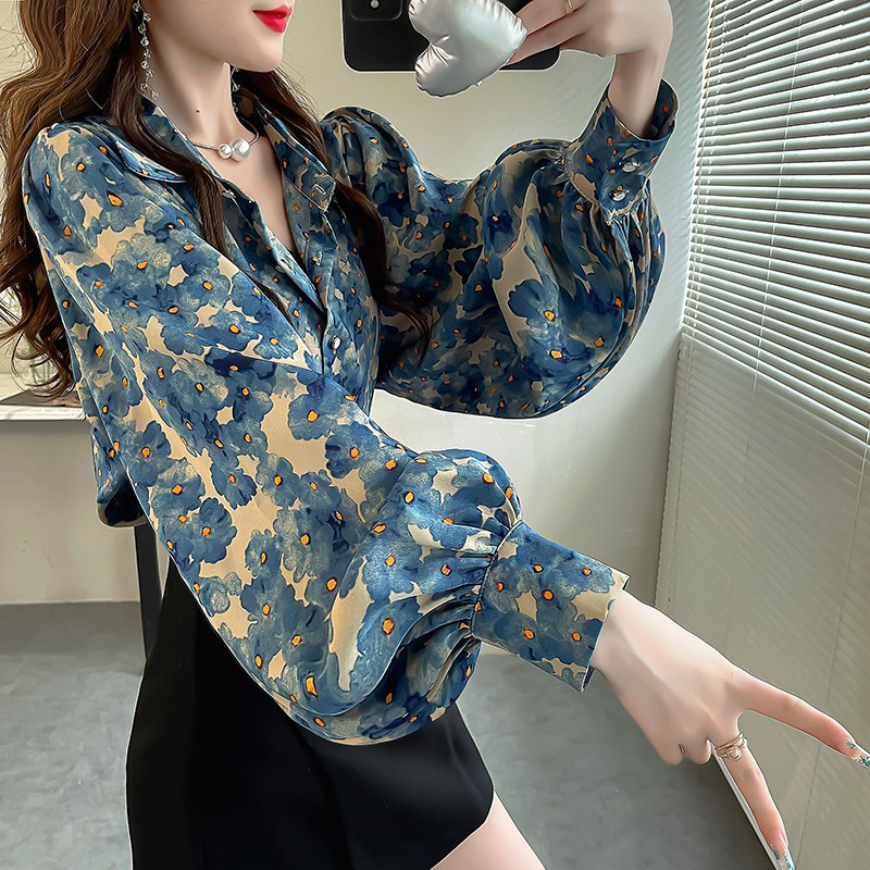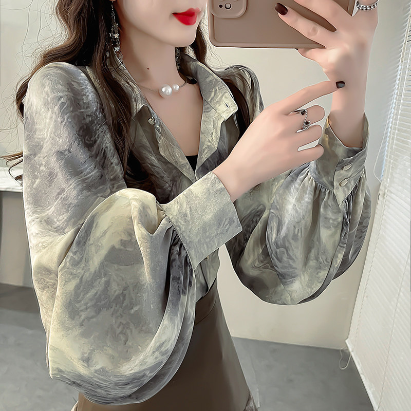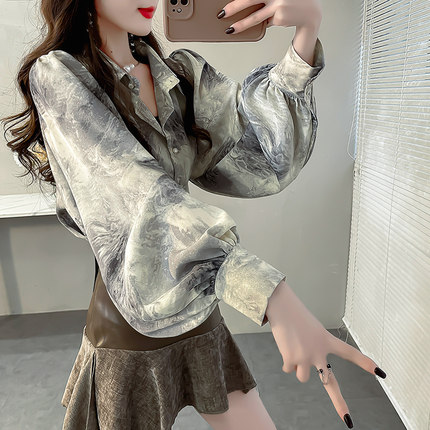 水墨印花新中式上衣女显瘦气质翻领雪纺衬衫时尚别致灯笼袖衬衣春