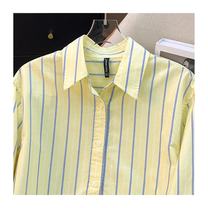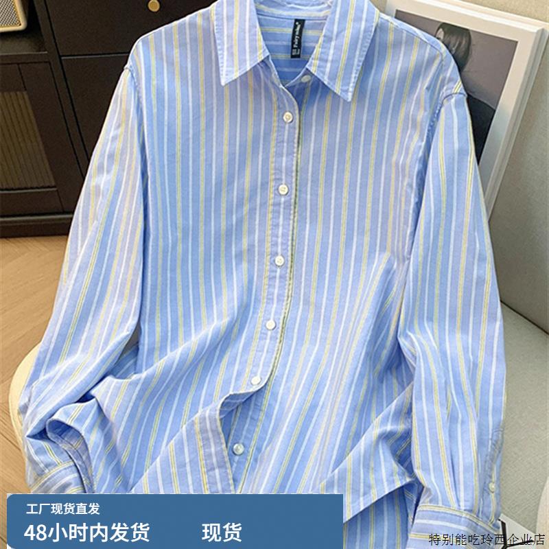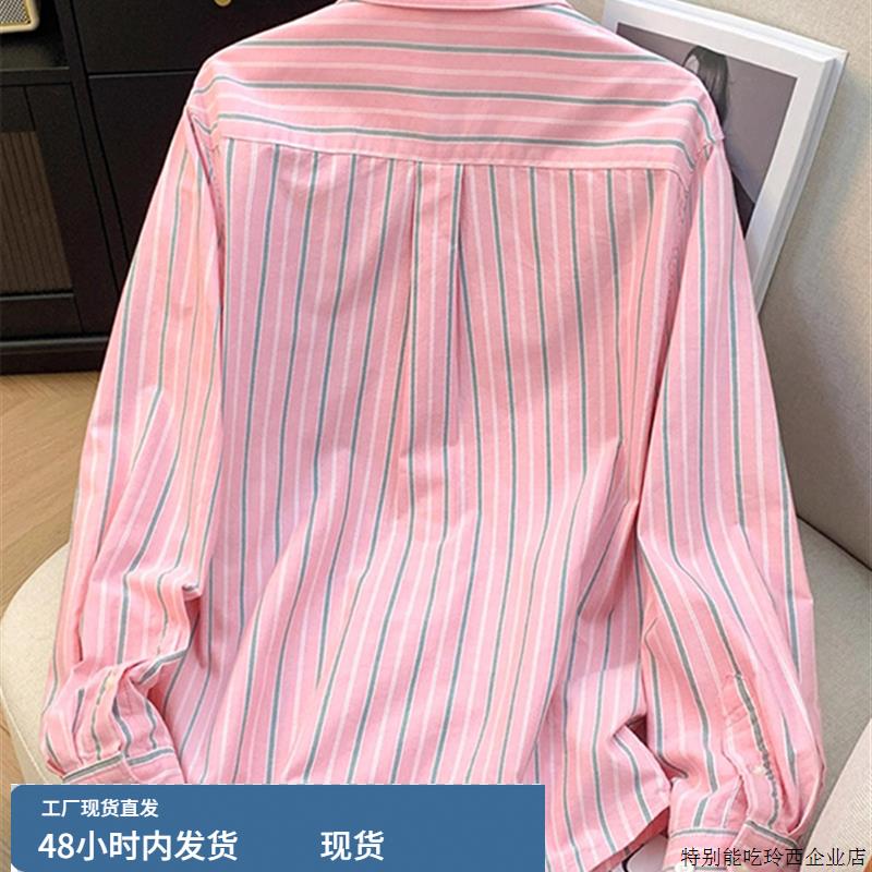 粉色条纹长袖衬衫外套女春秋欧货新款设计感休闲宽松防晒衬衣上衣