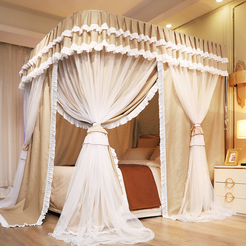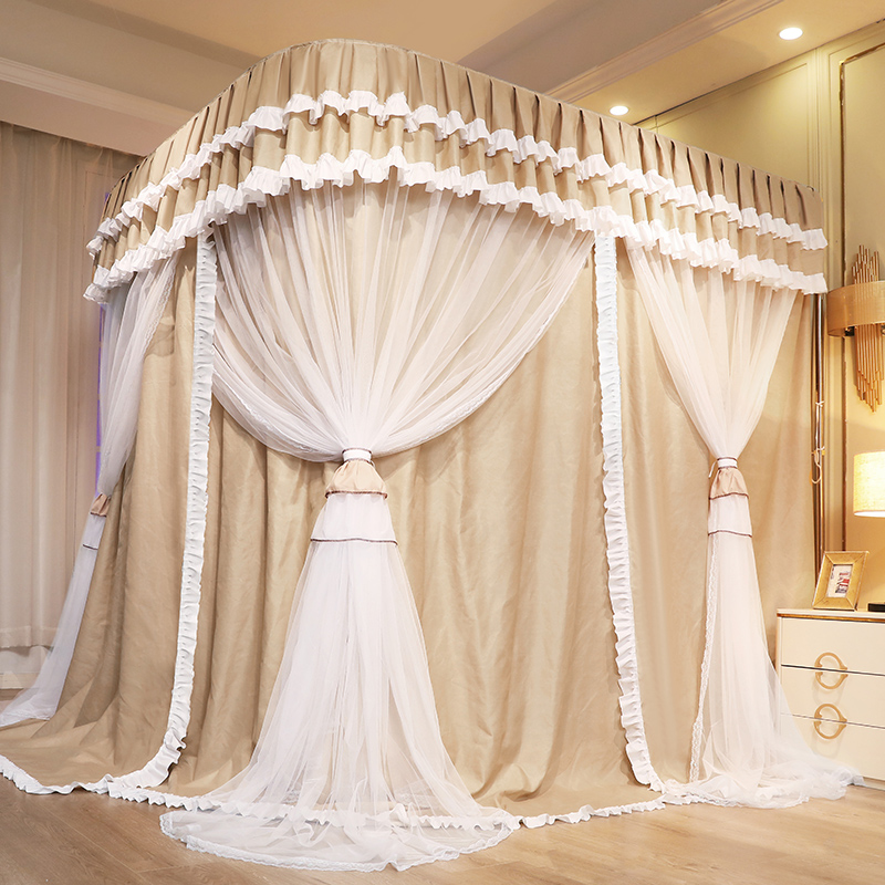 土豪金手动双层遮光帘导轨蚊帐三开门家用卧室加密加厚不锈钢支架